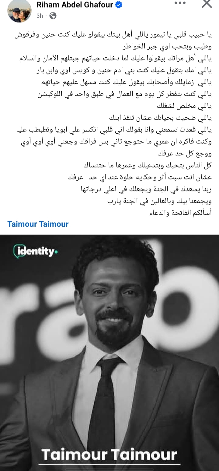 ونشرت ريهام عبد الغفور صورة له، من خلال حسابها الرسمي عبر موقع التواصل الاجتماعي "فيسبوك"، ونعته بكلمات مؤثرة، وكتب:" يا حبيب قلبي يا تيمور ياللي أهل بيتك بيقولو عليك كنت حنين وفرقوش وطيب وبتحب اوي جبر الخواطر".