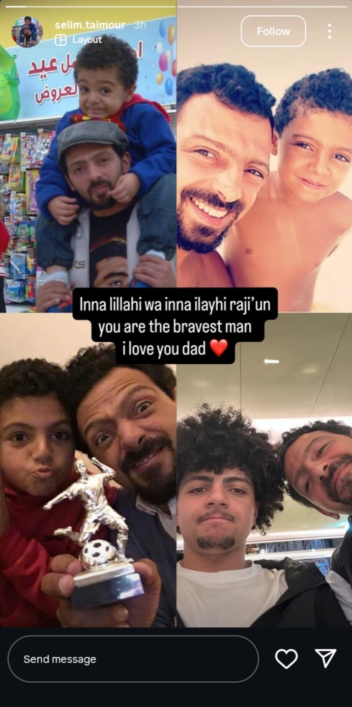 ونشر سليم تيمور صور تجمعه بوالده، من خلال حسابه الرسمي عبر موقع تبادل الصور والفيديوهات القصيرة "إنستجرام"، عبر خاصية استوري، وكتب:" أنت أشجع رجل في العالم.. أحبك يا أبي".