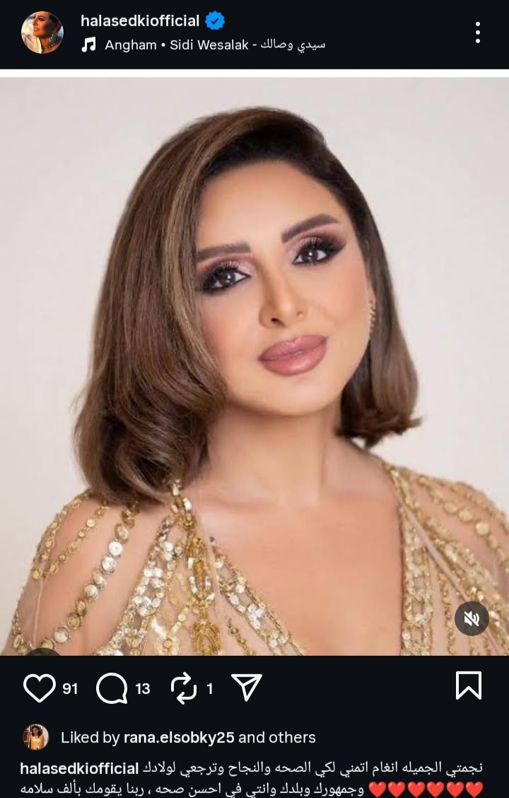 ونشرت هالة صدقي صورة لـ أنغام، من خلال حسابها الرسمي عبر موقع تبادل الصور والفيديوهات القصيرة "إنستجرام"، وكتبت:" نجمتي الجميلة أنغام اتمنى لكي الصحة والنجاح وترجعي لولادك وجمهورك وبلدك وأنتي في احسن صحة، ربنا يقومك بألف سلامة".