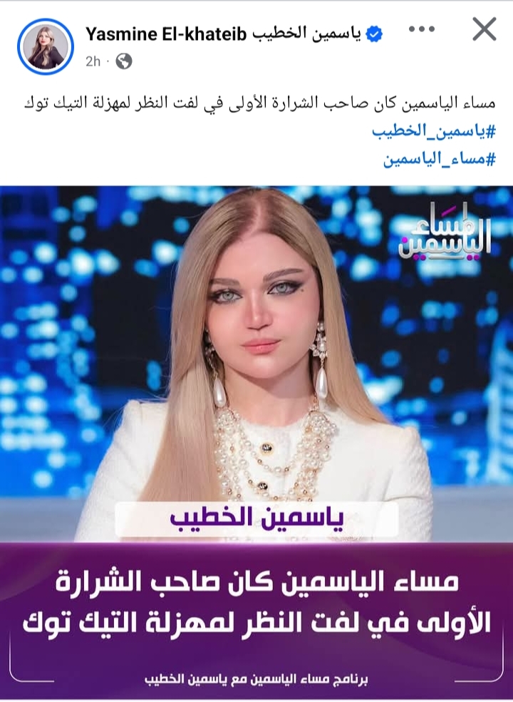 وكتبت ياسمين الخطيب من خلال حسابها الرسمي عبر موقع التواصل الاجتماعي "فيسبوك":" مساء الياسمين كان صاحب الشرارة الأولى في لفت النظر لمهزلة التيك توك.. ياسمين الخطيب.. مساء الياسمين ".