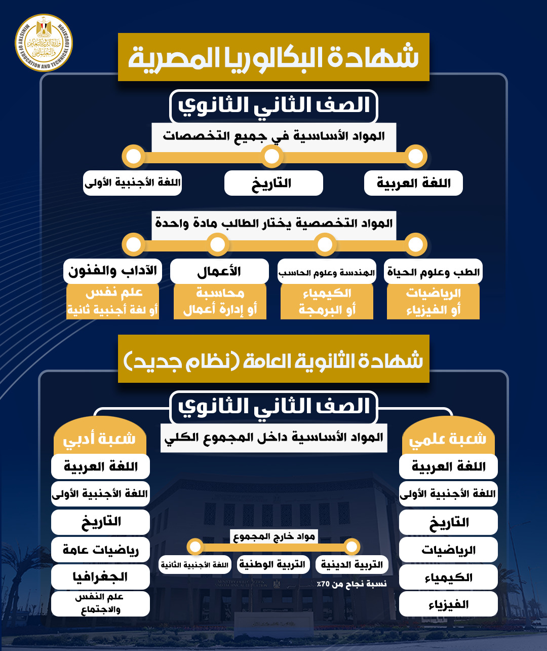 قدمت وزارة التربية والتعليم والتعليم الفني، شرحا تفصيليًا للمواد الدراسية في كل من نظام شهادة البكالوريا المصرية ونظام شهادة الثانوية العامة، وأهم القواعد المنظمة.