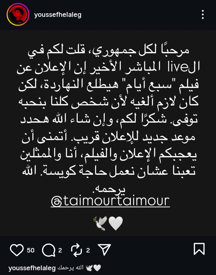 يوسف حمادة هلال يعلن تأجيل إعلان فيلم "سبعة أيام" حدادًا على وفاة "تيمور"