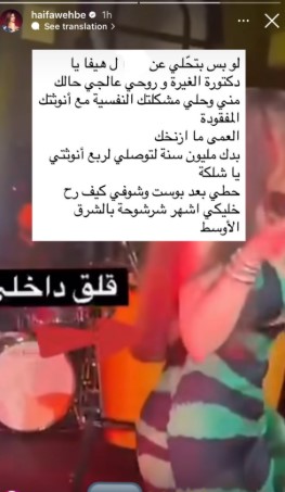 ولكن سرعان ما حذفت هيفاء وهبي هذا المنشور بعد احتواءه على ألفاظ خادشة للحياء وضد عادات وتقاليد المجتمع، وبعد مرور الوقت، كتبت هيفاء وهبي منشور آخر، وقالت: "خلونا نتكلم عن أصحاب الحسابات هذي اللي تتكلم عن لغة الجسد احس متعبين ويعيشون حياة متعبة".