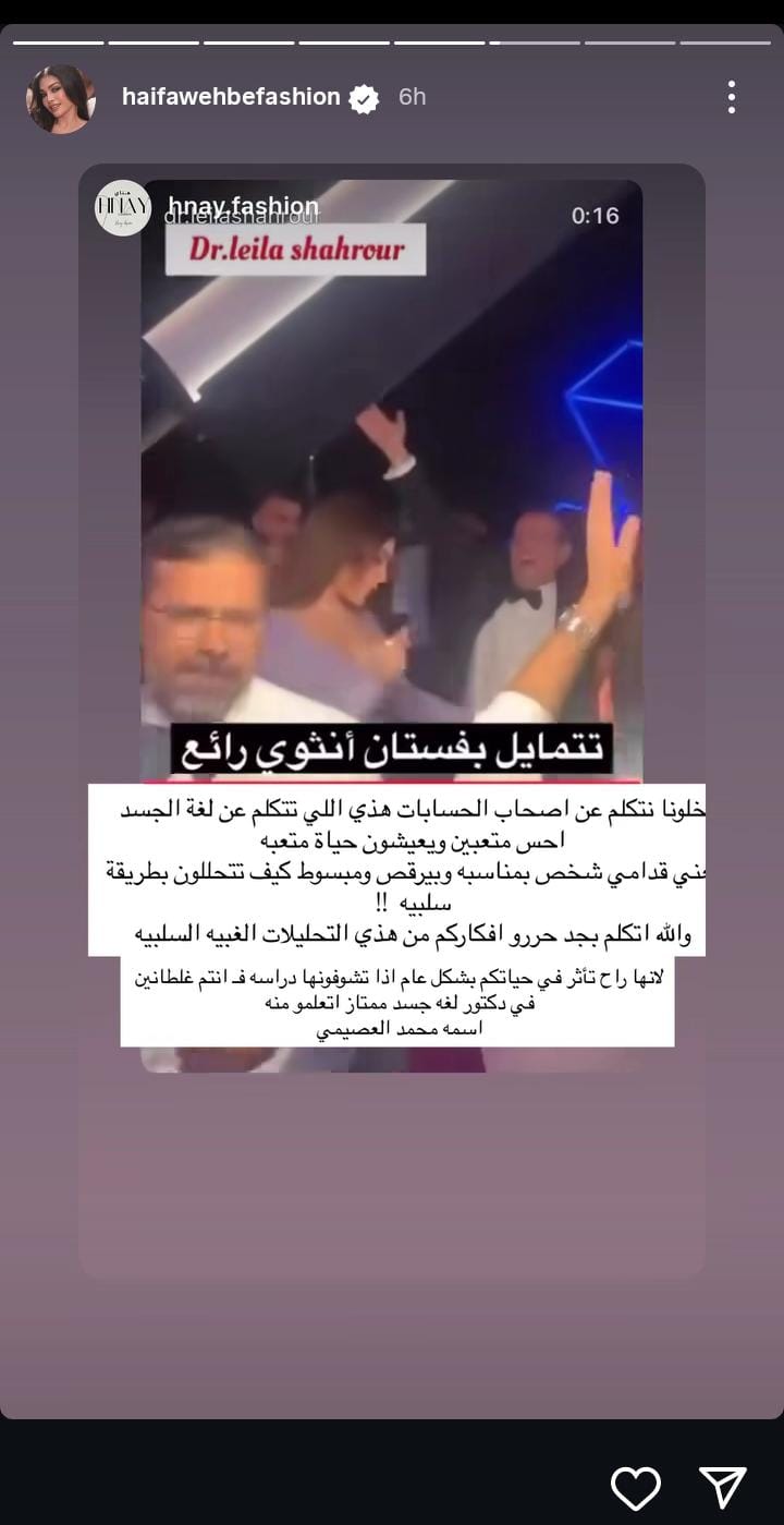 أضافت: "يعني قدامي شخص بمناسبة وبيرقص ومبسوط كيف تحللون بطريقة سلبية، والله اتكلم بجد حرروا أفكاركم من هذي التحليلات الغبية السلبية لانها راح تأثر في حياتكم بشكل عام اذا تشوفونها دراسة ف انتم غلطانين .. في دكتور لغة جسد ممتاز اتعلموا منه اسمه محمد العصيمي".