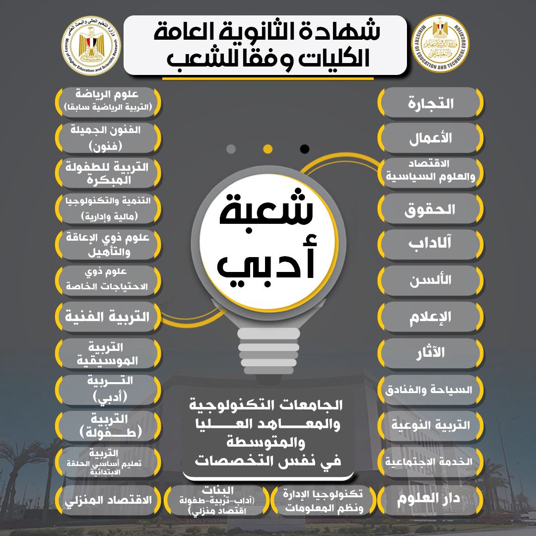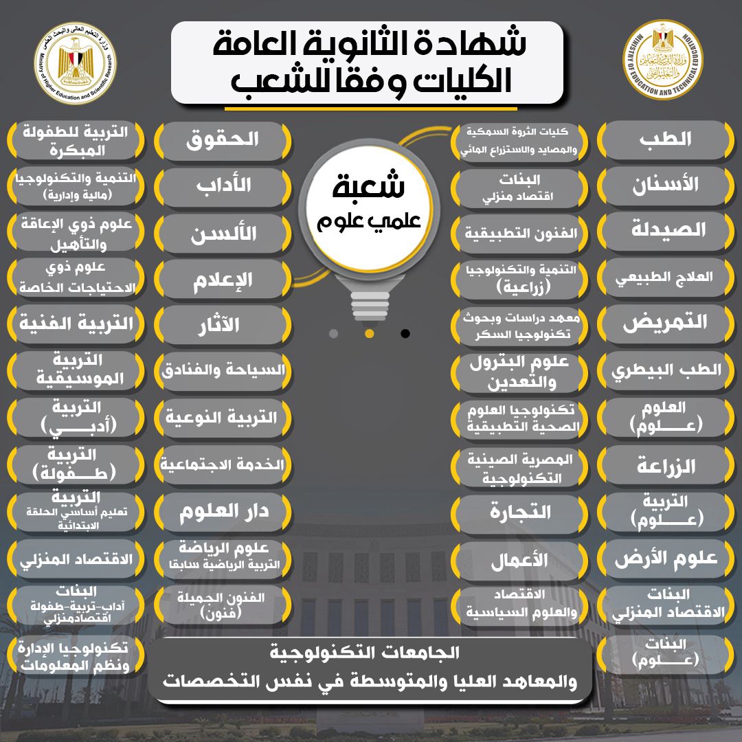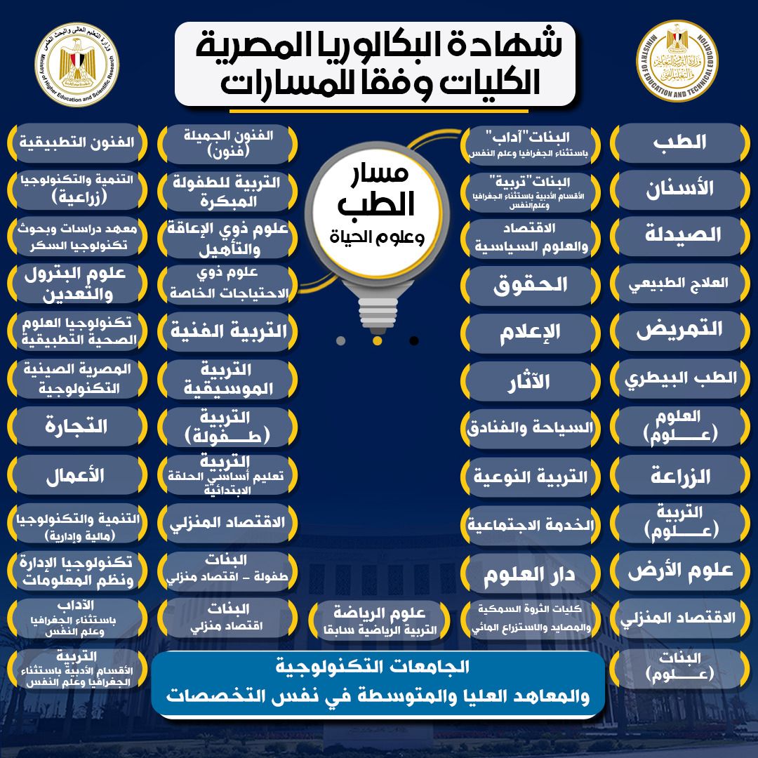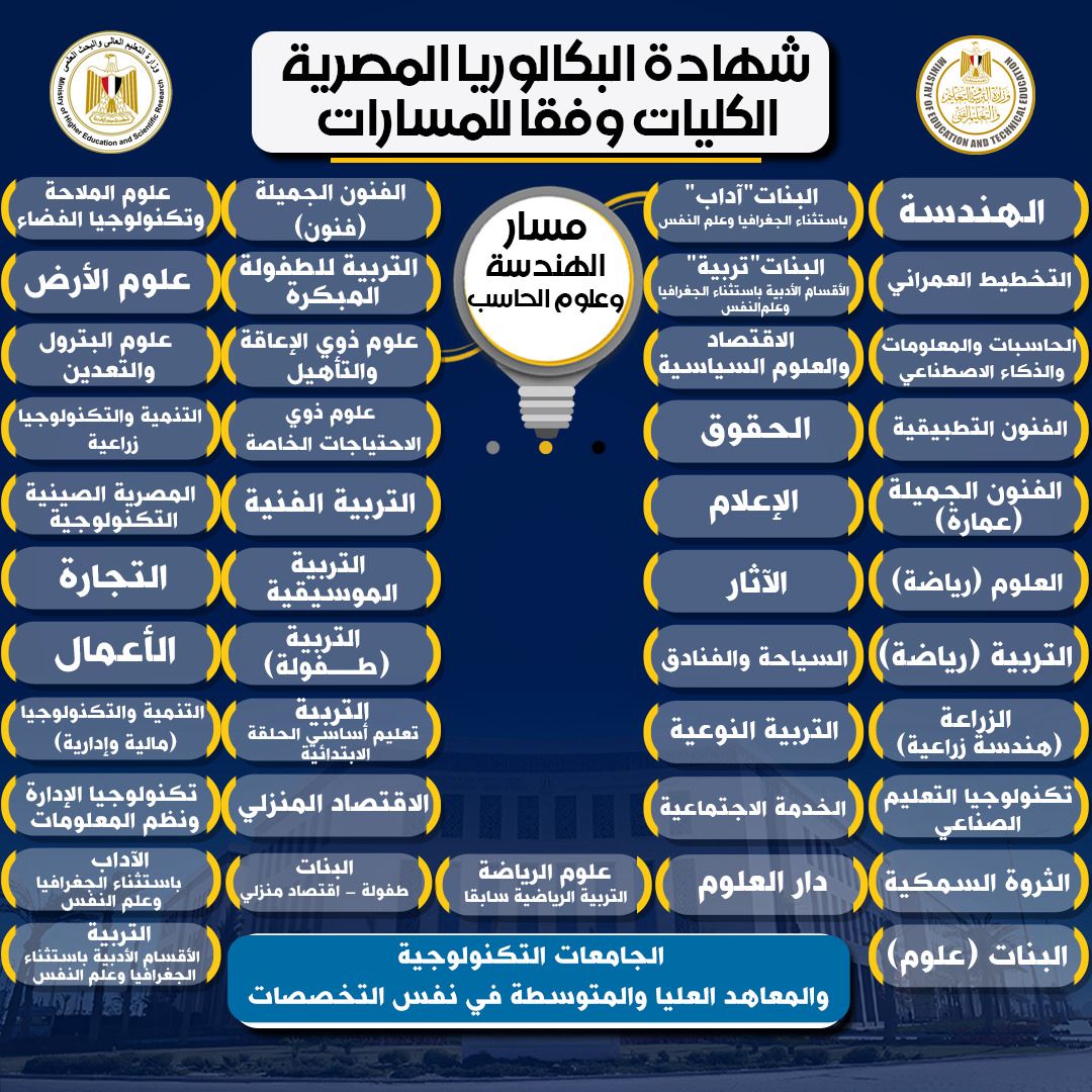 ردًا على استفسارات الطلاب وأولياء الأمور، تعيد وزارة التعليم العالي والبحث العلمي، بالتنسيق مع وزارة التربية والتعليم والتعليم الفني، نشر التفاصيل الخاصة بالكليات والتخصصات الجامعية المتاحة للمسارات المختلفة في نظامي البكالوريا الجديد والثانوية العامة، بما يتيح للطلاب وأولياء الأمور صورة واضحة عن الخيارات التعليمية المستقبلية.