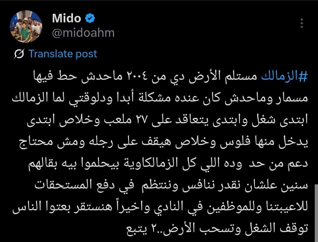 واختتم ميدو تصريحاته بالتأكيد على امتلاكه جميع المستندات الرسمية التي تثبت صحة موقف الزمالك، مناشدًا المسؤولين التدخل ودعم النادي وفقًا للقانون، ووضع حد لأي محاولات تعطل المشروع. كما أعرب عن ثقته في أن الدولة تدرك أهمية المشروع بالنسبة لمستقبل الزمالك واستقراره.