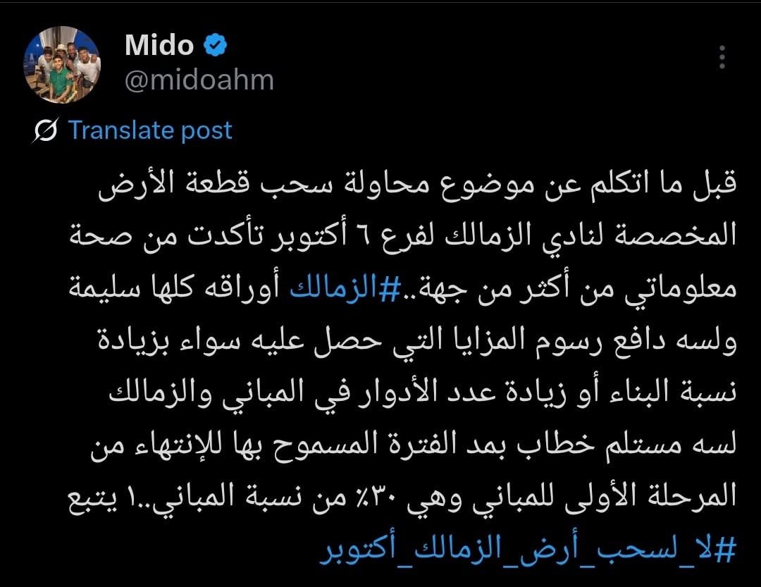 وقال ميدو، عبر منشور له على منصة "إكس"، إنه تأكد من صحة المعلومات الخاصة بالملف من أكثر من جهة، مشددًا على أن أوراق نادي الزمالك سليمة، حيث قام النادي بسداد رسوم المزايا المتعلقة بزيادة نسبة البناء ورفع عدد الأدوار في المباني، كما تسلم النادي خطابًا رسميًا بمد الفترة المقررة للانتهاء من المرحلة الأولى، والتي تقدر بنسبة 30% من إجمالي المباني.