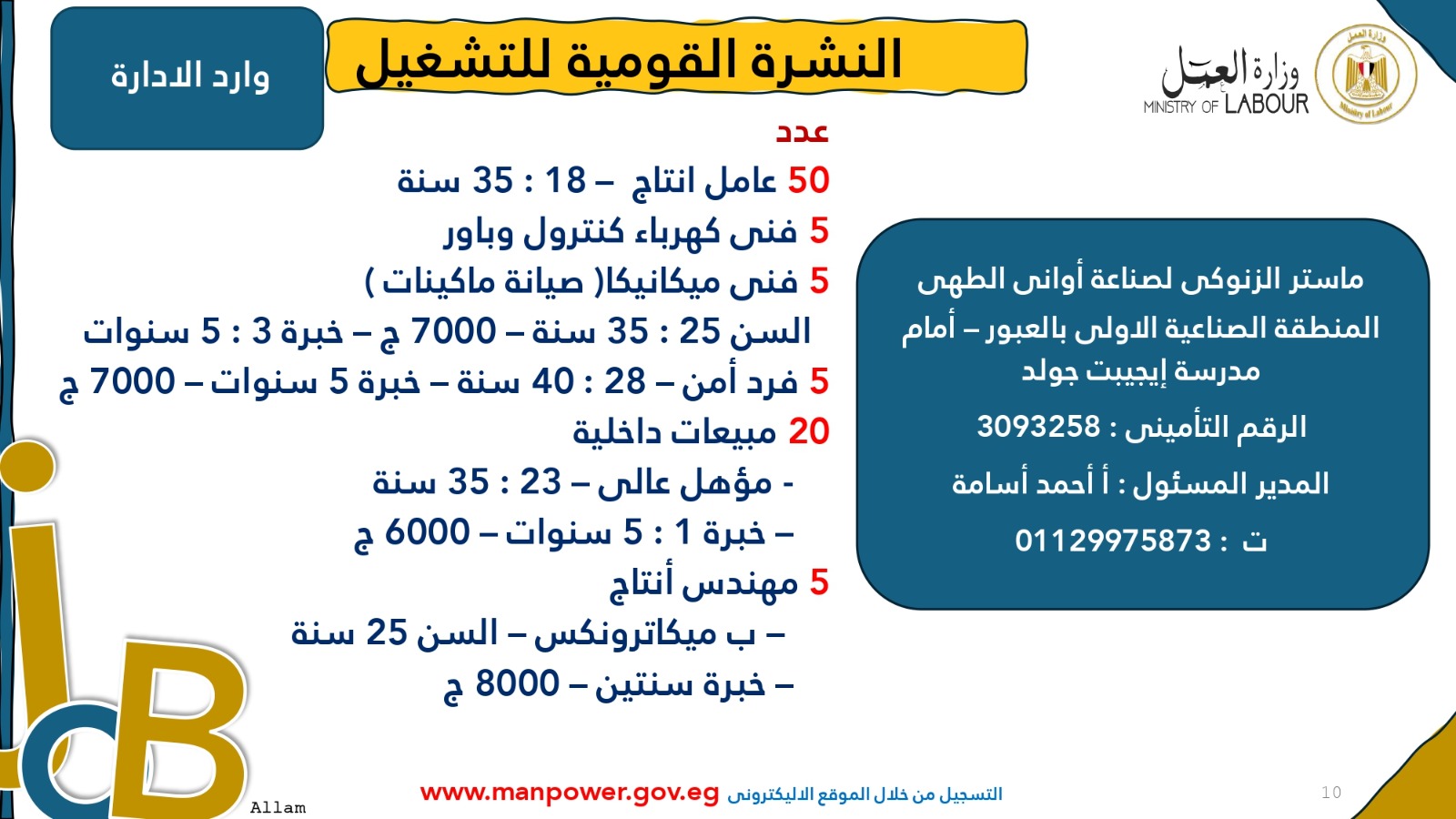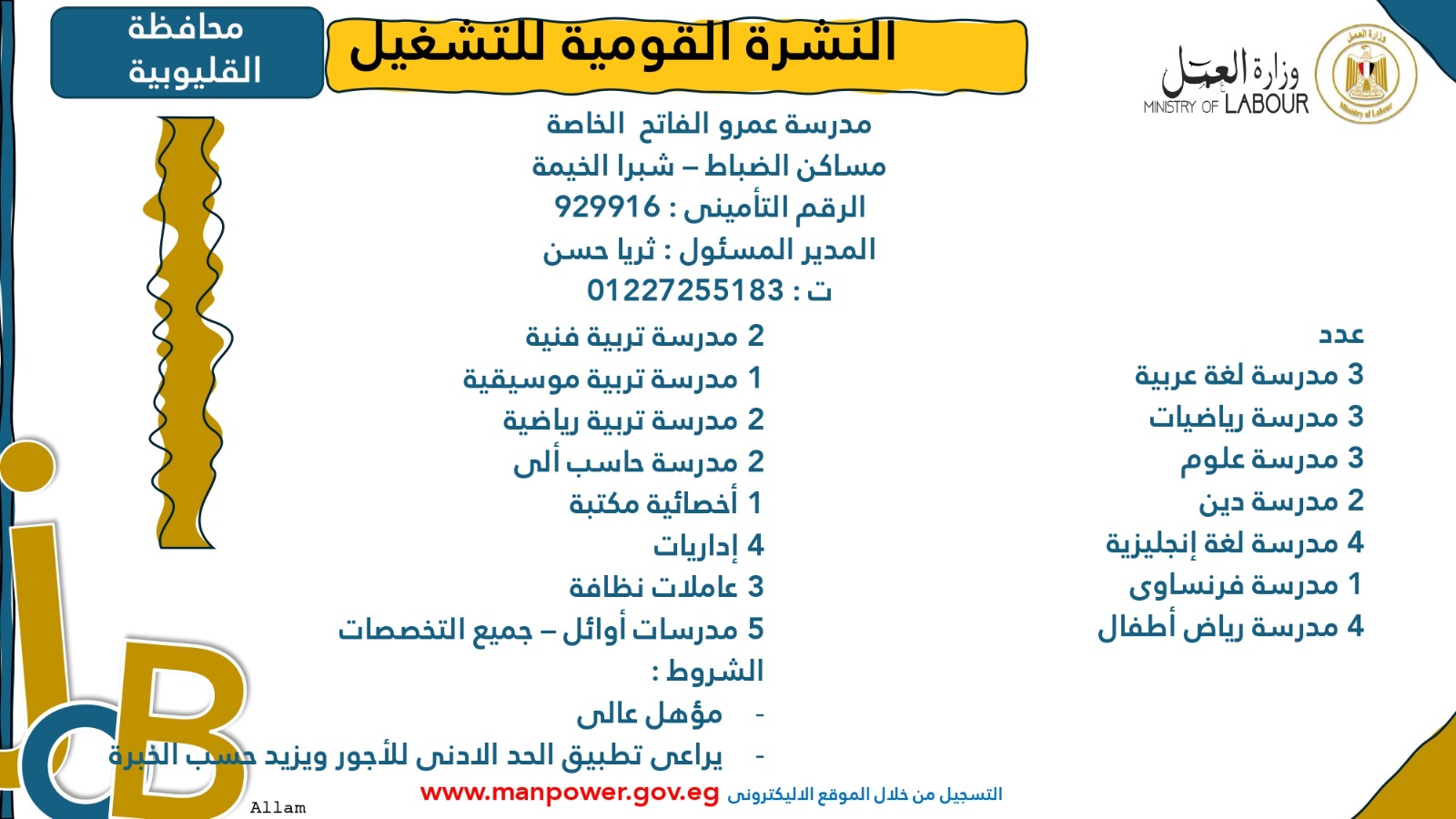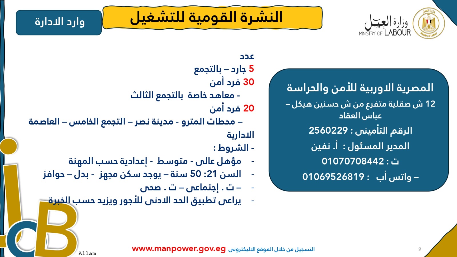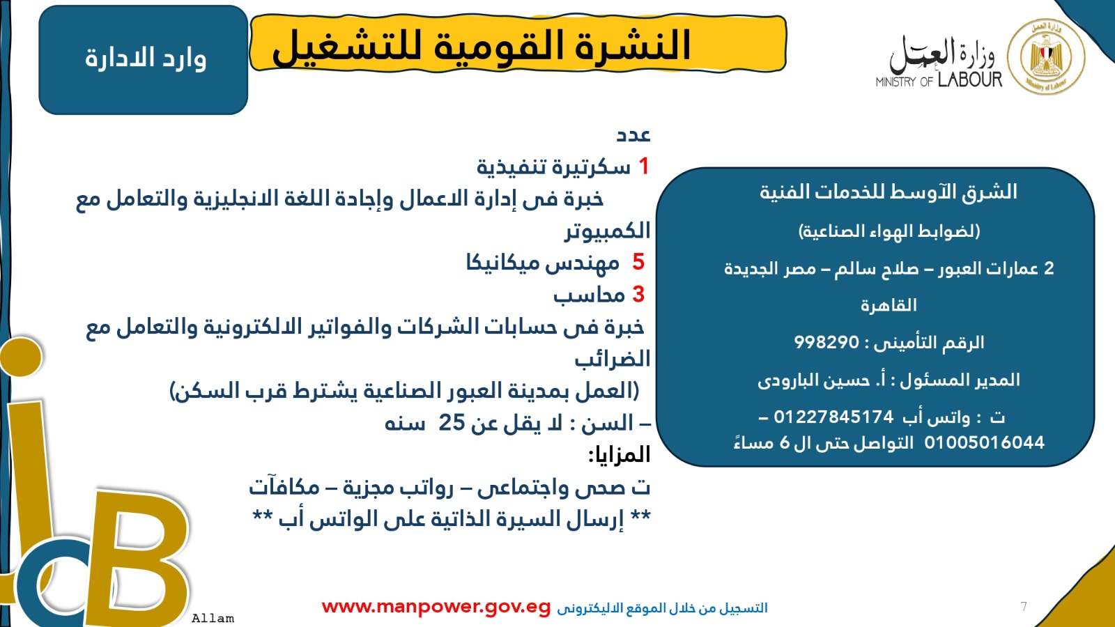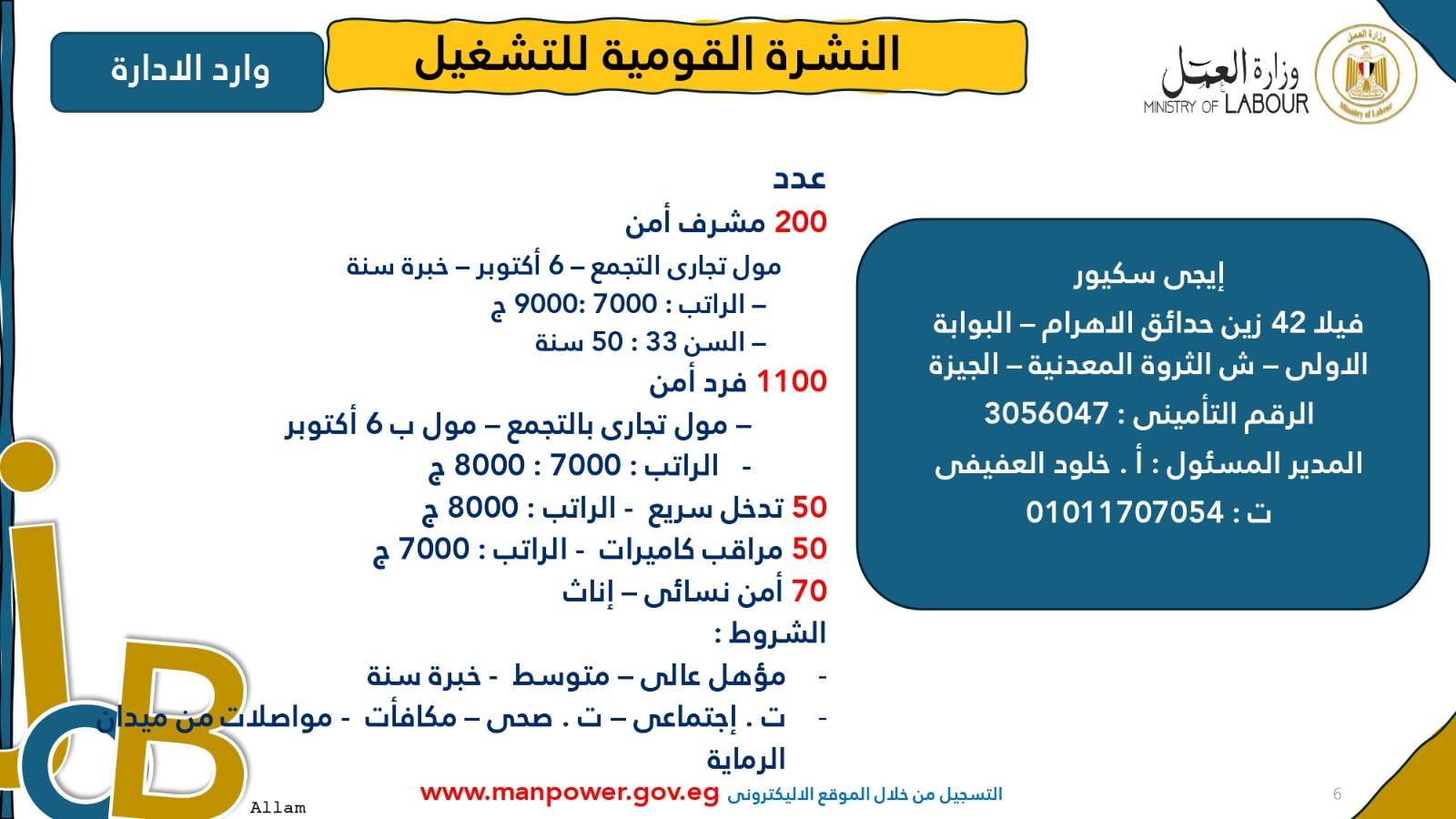 وفي تخصصات منها : أخصائي تسويق ، وأخصائي موارد بشرية، ومهندس إتصالات ، ومهندسين كهرباء جميع التخصصات، ومشرفي ميكانيكا وتحكم كهرباء ، ومدير صيانة ، ومحاسبين ، ومشرف تنجيد ، وليدى جارد – إناث ، ومشرف عام ، ومشرف موقع ، وشيف ، وأخصائي مشتريات ، وبائعين، ومقدم طلبات ، واخصائى تمويل ، وأمين مخازن، ومهندسين ميكانيكا ، وإنتاج وجودة، وأعمال إدارية، وسائقين رخصة أولى وثانية وثالثة، ومندوبين مبيعات ، ومراقبين جودة، وفنيين جميع التخصصات، ومشرفي إنتاج ، وأفراد أمن ، ومهن الفندقة والمطاعم بكافة الأقسام ،وعمال انتاج، وعمال نظافة،وتخصصات أخرى.. وجاء في البيان أن النشرة تضم مجموعة من الوظائف لذوى همم بالمحافظات ، وذلك لاستيفاء نسبة الـ 5 % من بين إجمالى عمالها من تلك الفئة ، برواتب مجزية، وذلك فى إطار تنفيذ خطة" الوزارة" بحصر وتدريب وتشغيل ذوي الهمم خلال الفترة الحالية ، وإلزام المنشآت بتشغيل نسبة 5% من إجمالي عمالها من ذوى القدرات الخاصة ،تنفيذًا للقانون رقم 10 لسنة 2018 ، ولتوجيهات فخامة الرئيس عبدالفتاح السيسي رئيس الجمهورية،بدمجهم في سوق العمل.