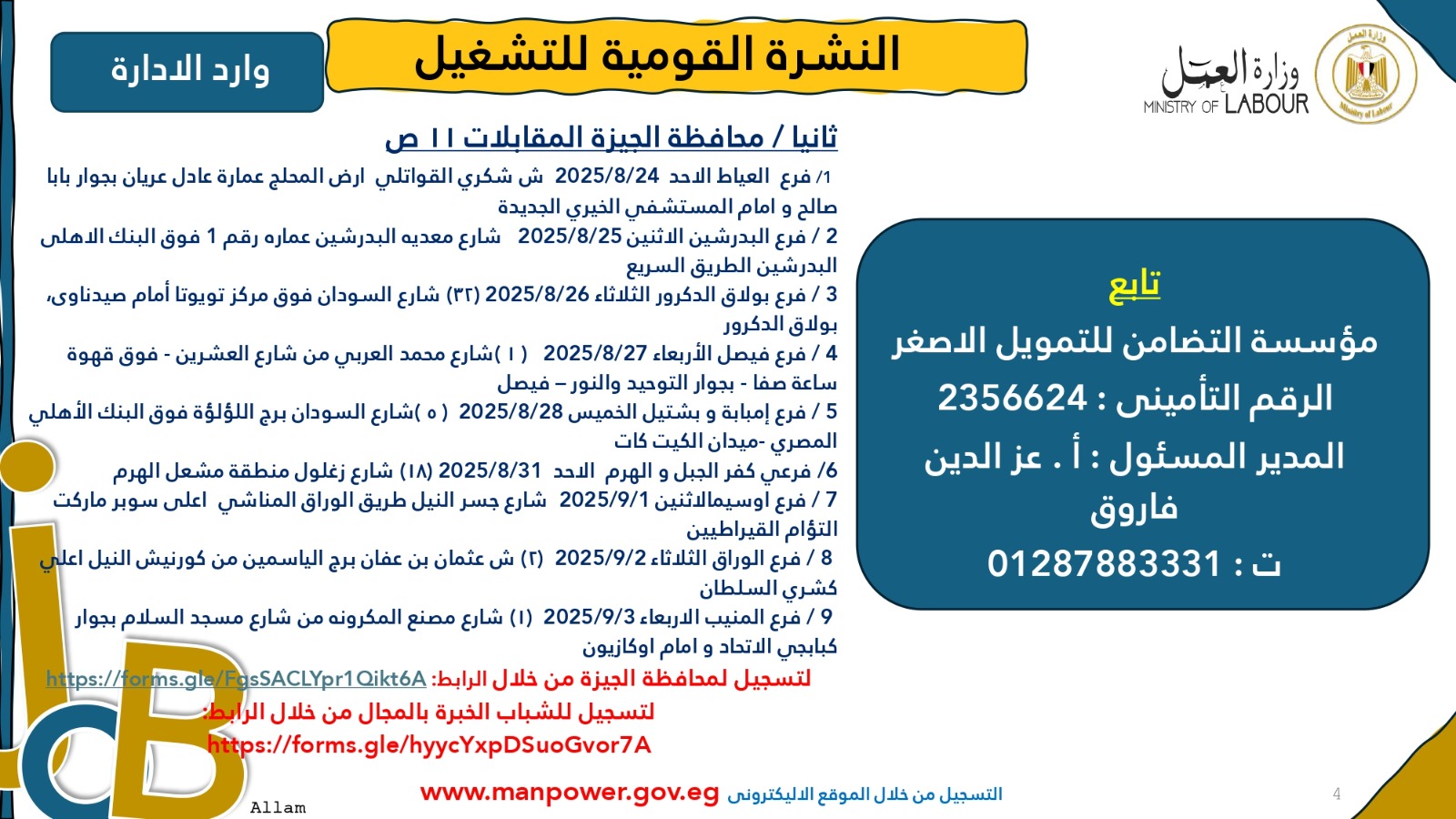 وقالت"الوزارة" في بيان أنها تلقت، طلبات جديدة من 48 شركة قطاع خاص في 12محافظة لديها 4374 وظيفة مٌتوفرة الآن، في عددِ من التخصصات، منها لأصحاب القُدرات الخاصة "ذوي الهمم"، وذلك برواتب مجزية تحدد حسب المقابلة ،وفقاً للحد الأدنى للأجور ،فضلاً عن التأمين الصحي والاجتماعى..وأوضحت "الوزارة" أن التقديم على هذه "الفرص الجديدة" خلال شهري أغسطس وسبتمبر 2025، عن طريق مكتب الإدارة العامة للتشغيل بمقر "الوزارة" القديم بمدينة نصر،أو مديريات العمل بالمحافظات ، أو أرقام وعناوين الشركات المُرفقة مع هذا البيان، وكذلك على الموقع الرسمي لوزارة العمل على "الإنترنت".
