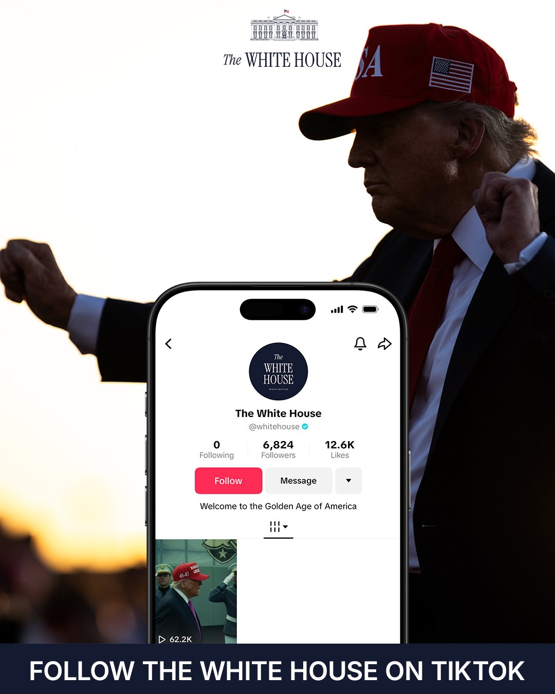 أطلق البيت الأبيض حساباً رسمياً على "تيك توك" ليستفيد من وجود أكثر من 170 مليون مستخدم أمريكى لتطبيق مقاطع الفيديو القصيرة لنشر رسائل الرئيس دونالد ترامب.
