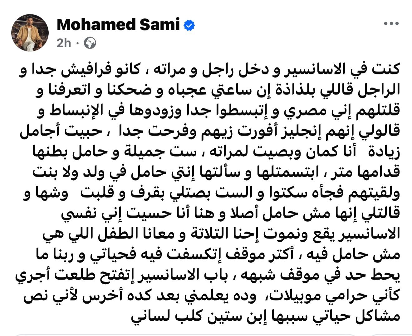 وأضاف محمد سامي: حبيت أجامل زيادة أنا كمان وبصيت لمراته، ست جميلة وحامل بطنها قدامها متر، ابتسمتلها وسألتها إنتي حامل في ولد ولا بنت ولقيتهم فجأه سكتوا والست بصتلي بقرف وقلبت وشها وقالتلي إنها مش حامل أصلًا وهنا أنا حسيت إني نفسي الأسانسير يقع ونموت إحنا الثلاثة ومعانا الطفل اللي هي مش حامل فيه.