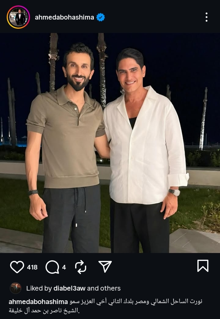 ونشر أبو هشيمة صورة تجمعه بسمو الشيخ ناصر بن حمد، خلال تواجدهما في الساحل، من خلال حسابه الرسمي عبر موقع تبادل الصور والفيديوهات القصيرة "إنستجرام"، وعلق:"نورت الساحل الشمالي ومصر بلدك الثاني أخي العزيز سمو الشيخ ناصر بن حمد آل خليفة".