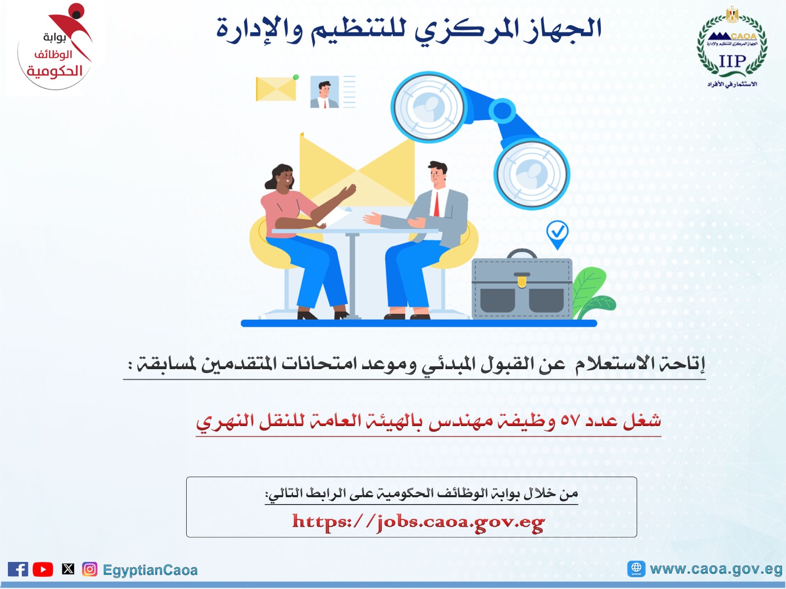أعلن الجهاز المركزي للتنظيم والإدارة، برئاسة المهندس حاتم نبيل، عن إتاحة الاستعلام عن القبول المبدئي وموعد ومكان خوض الامتحان للمتقدمين في مسابقة شغل 57 وظيفة مهندس بالهيئة العامة للنقل النهري التابعة لوزارة النقل، وذلك على الموقع الإلكتروني لبوابة الوظائف الحكومية: https://jobs.caoa.gov.eg/