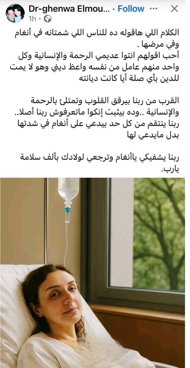 وكتبت غنوى الموجي من خلال حسابها الرسمي عبر موقع التواصل الاجتماعي "فيسبوك"، قالت:" الكلام اللي هقوله ده للناس اللي شمتانة في أنغام ومرضها".
