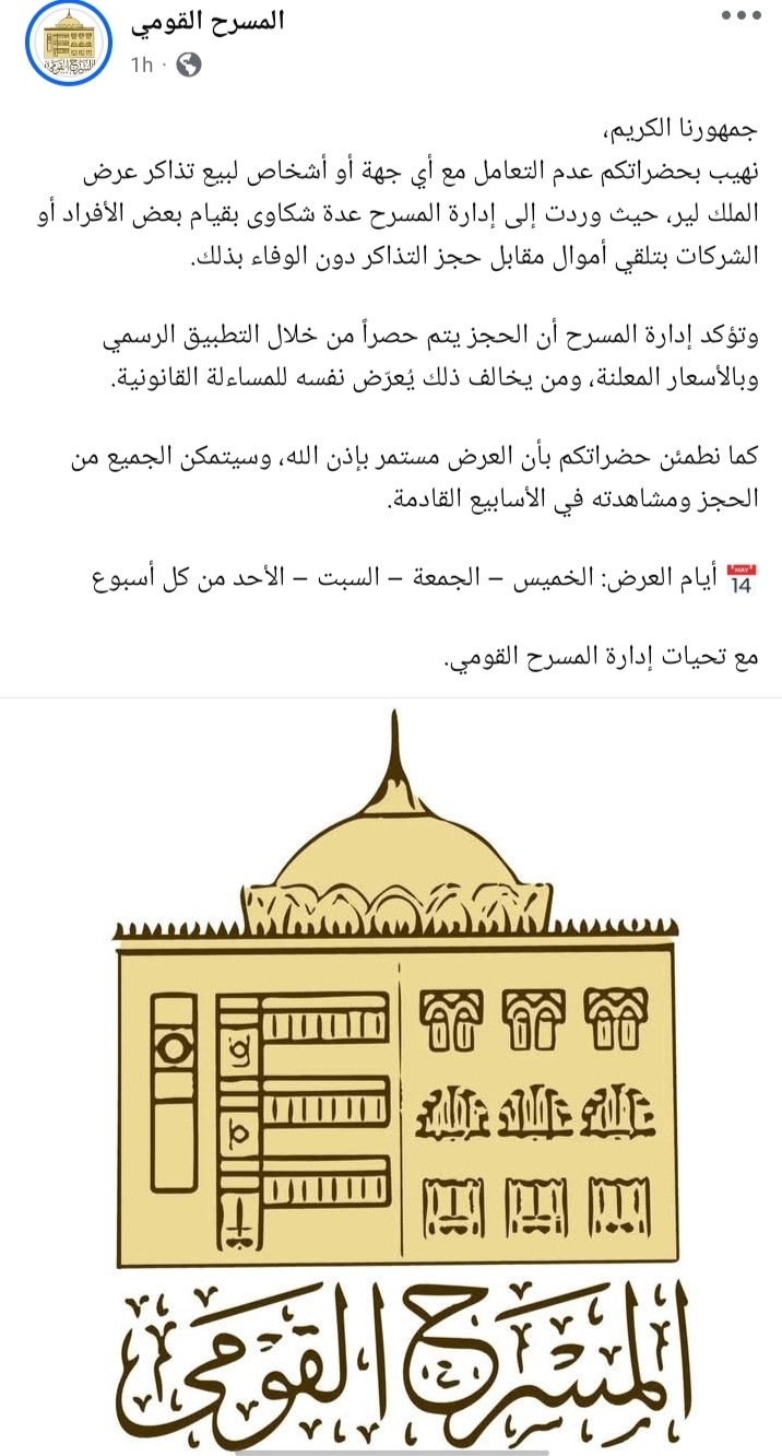 أضاف: وتؤكد إدارة المسرح أن الحجز يتم حصراً من خلال التطبيق الرسمي وبالأسعار المعلنة، ومن يخالف ذلك يُعرّض نفسه للمساءلة القانونية.