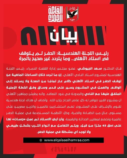أكد الدكتور سعد الجيوشي، عضو مجلس إدارة النادي الأهلي ورئيس اللجنة الهندسية لمشروع استاد النادي، أن ما تردد خلال الساعات الماضية بشأن توقف أعمال الحفر في الاستاد عارٍ تمامًا من الصحة ولا يستند إلى الواقع.