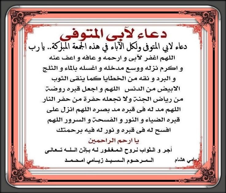 • اللهم إن يوم الجمعة يوم مبارك، فأكرم أبي بمغفرتك ورحمتك ووسع له في قبره مد بصره.