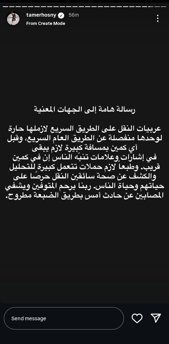 وجّه الفنان تامر حسني رسالة إلى الجهات المعنية، طالب خلالها بضرورة اتخاذ إجراءات عاجلة لحماية المواطنين على الطرق، وذلك تعليقًا على حادث الضبعة بمحافظة مطروح الذي وقع أمس.