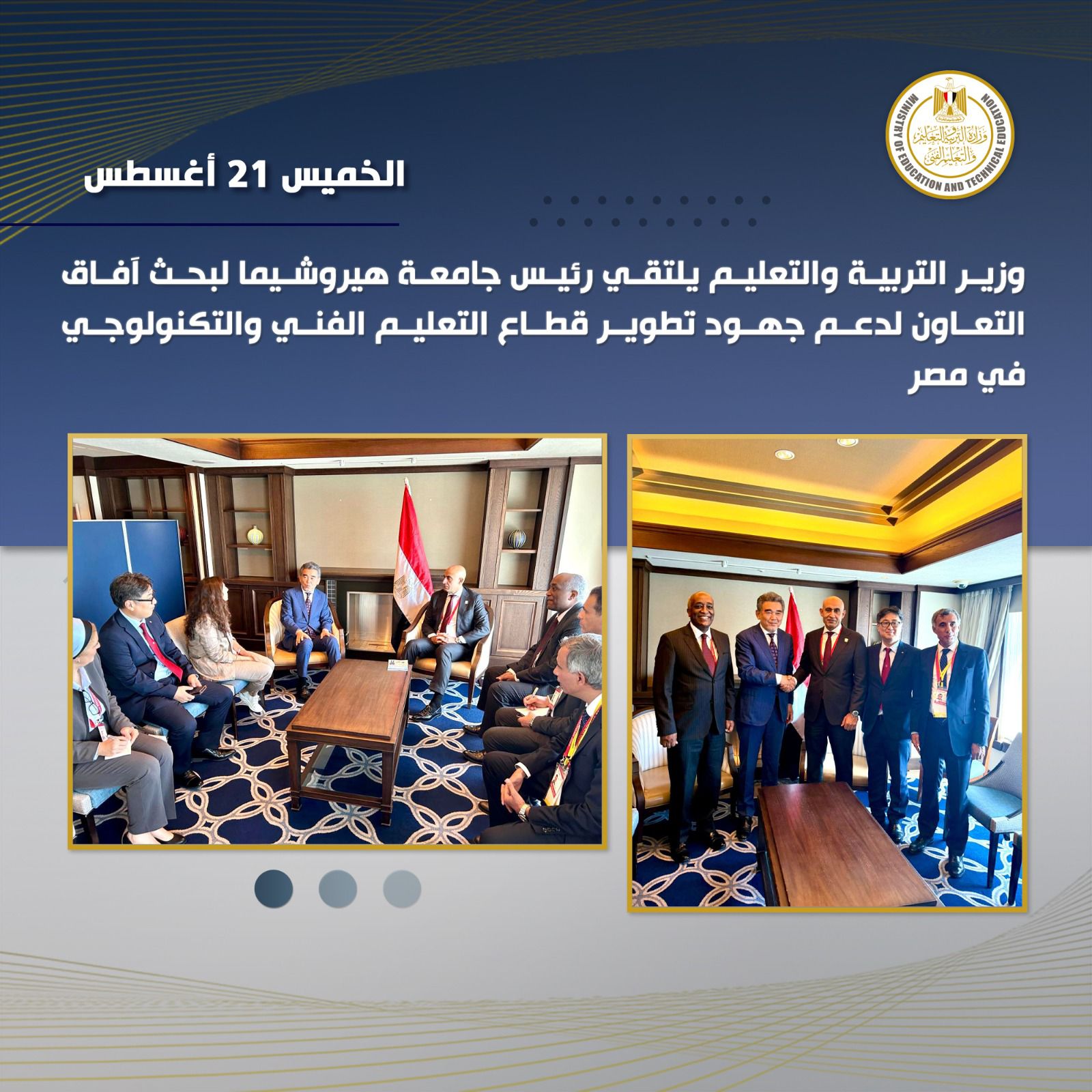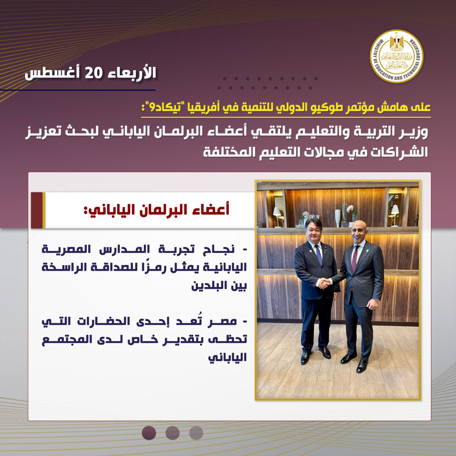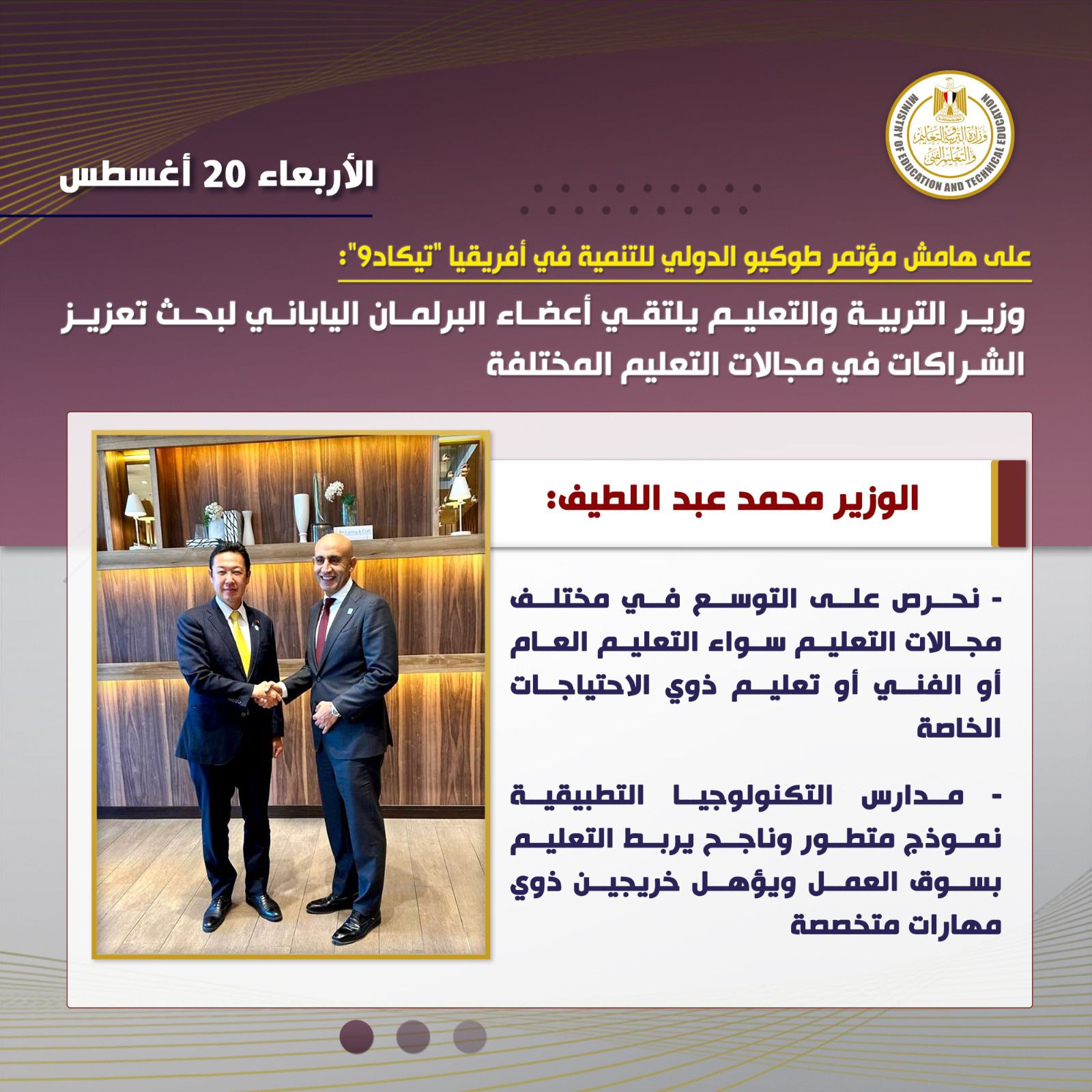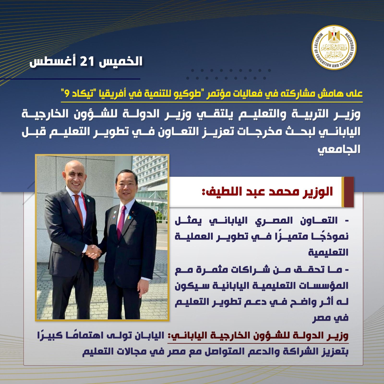 جاء ذلك بمقر وزارة التعليم اليابانية، على هامش مشاركة السيد الوزير محمد عبد اللطيف في مؤتمر طوكيو الدولي للتنمية في أفريقيا في دورته التاسعة، قمة "تيكاد ٩"، التي تستضيفها مدينة يوكوهاما اليابانية خلال الفترة من ٢٠ إلى ٢٢ أغسطس الجاري.