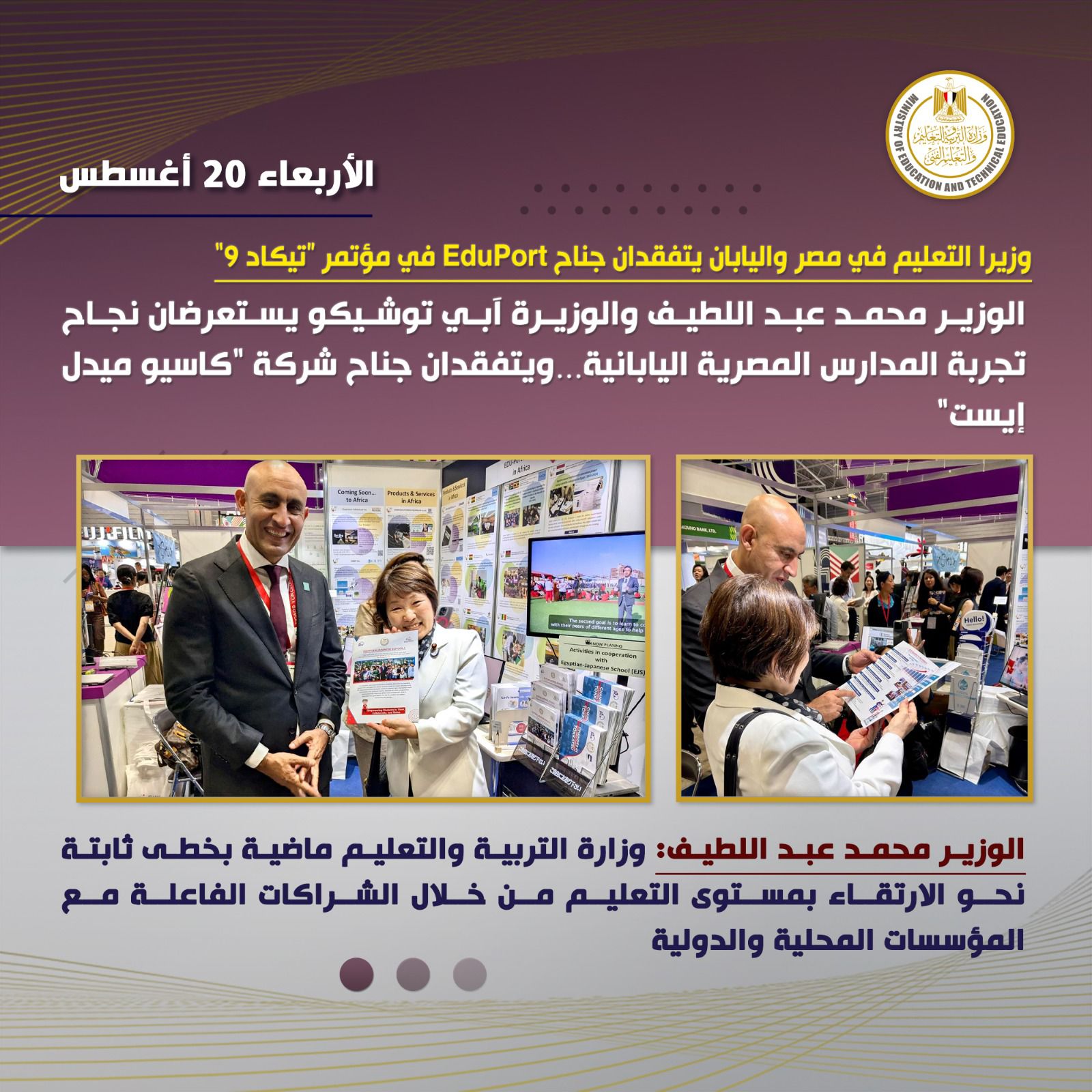 تفقد السيد محمد عبداللطيف وزير التربية والتعليم والتعليم الفني ترافقه السيدة آبي توشيكو، وزيرة التعليم والثقافة والرياضة والعلوم والتكنولوجيا اليابانية (MEXT) جناح مبادرة EduPort التابع لوزارة التعليم اليابانية، وذلك في إطار مشاركته بمؤتمر طوكيو الدولي للتنمية في أفريقيا “تيكاد ٩”.