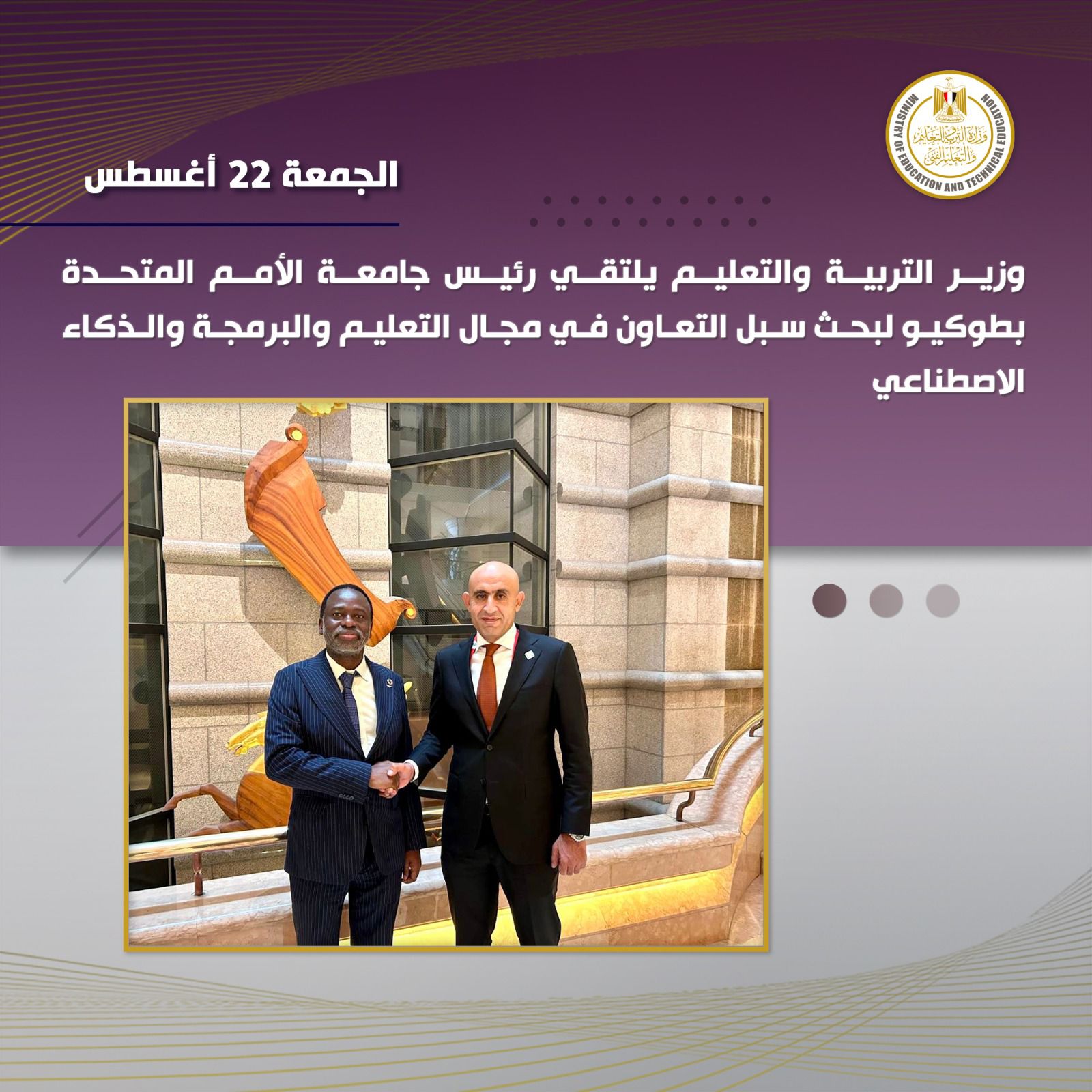 التقى السيد محمد عبد اللطيف وزير التربية والتعليم والتعليم الفني، مع البروفيسور تشيليدزى ماروالا رئيس جامعة الأمم المتحدة في طوكيو، وذلك على هامش مشاركته في فعاليات مؤتمر طوكيو للتنمية فى أفريقيا "تيكاد ٩" باليابان، لبحث سبل تعزيز التعاون بين الجانبين في مجالات التعليم والبرمجة والذكاء الاصطناعي.