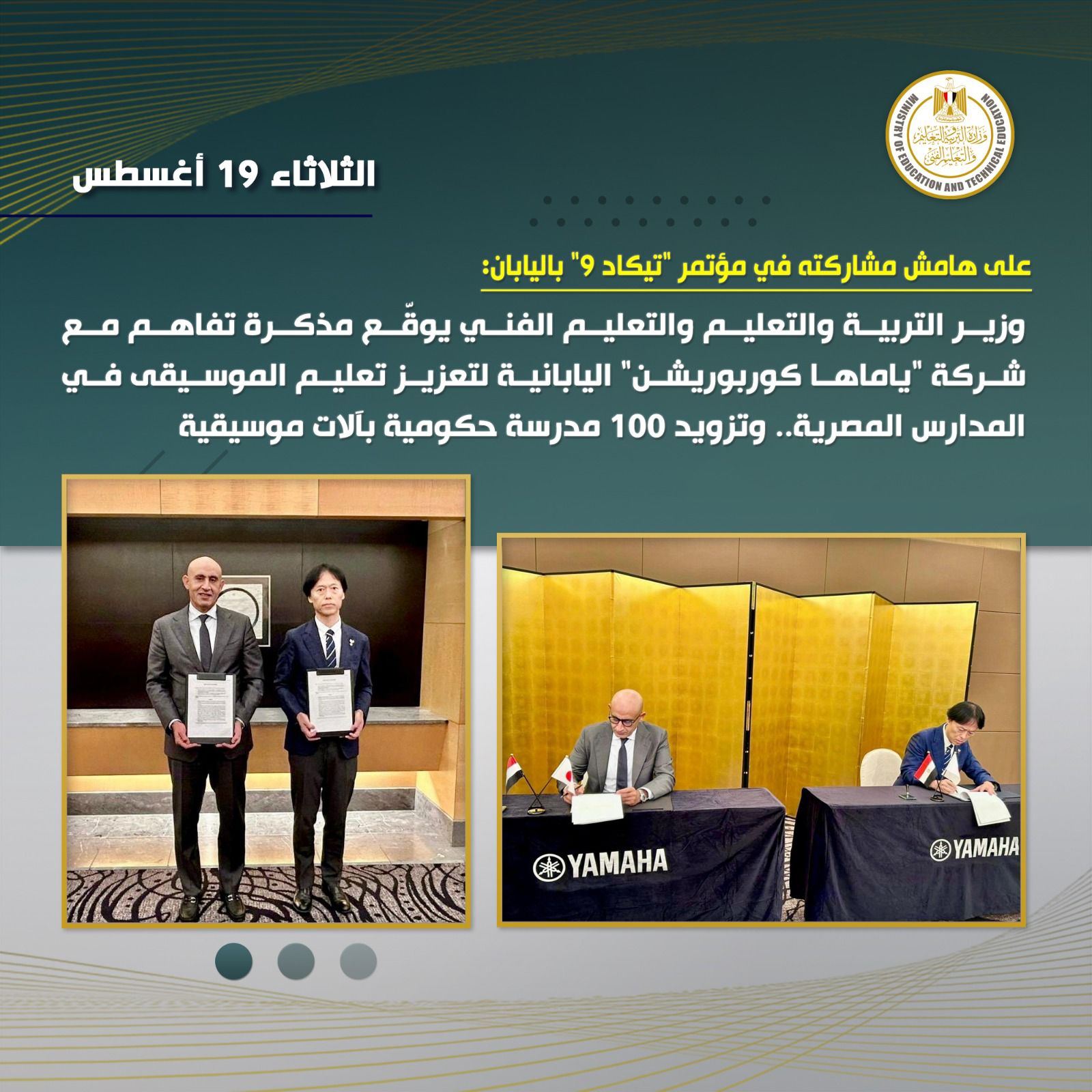 وقع السيد محمد عبداللطيف، وزير التربية والتعليم والتعليم الفني، على هامش مشاركته في مؤتمر طوكيو الدولي للتنمية في أفريقيا “تيكاد ٩”، مذكرة تفاهم مع شركة "ياماها كوربوريشن" اليابانية، لتنفيذ مشروع تجريبي يهدف إلى إدخال الآلات الموسيقية في عدد من المدارس المصرية الحكومية، وتدريب معلمي الموسيقى على استخدامها ضمن البرامج التعليمية، حيث تضمن توقيع مذكرة التفاهم تزويد 100 مدرسة حكومية بآلات موسيقية.