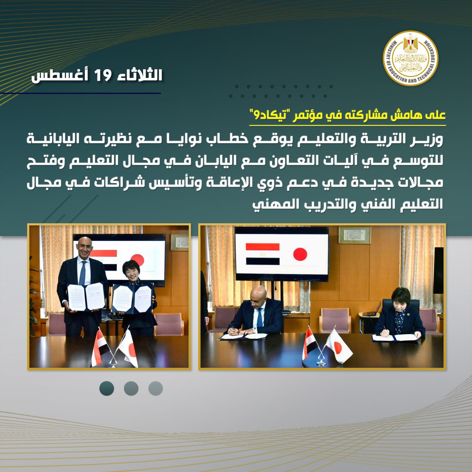 على هامش مشاركته، نيابة عن فخامة الرئيس عبد الفتاح السيسي، رئيس الجمهورية، في مؤتمر طوكيو الدولي للتنمية في أفريقيا بدورته التاسعة، قمة "تيكاد ٩"، التي تستضيفها مدينة يوكوهاما اليابانية، شهد صباح اليوم الدكتور مصطفى مدبولي، رئيس مجلس الوزراء، مراسم توقيع مذكرتي تفاهم للتعاون في مجال التعليم العام والتعليم الفنى بين وزارة التربية والتعليم والتعليم الفنى، وحكومة طوكيو الحضرية، وذلك بهدف تعزيز التعاون في مجال التعليم الفني والتدريب المهني، وكذا دعم تعليم ذوى الاحتياجات الخاصة وتدريب المعلمين، وذلك بحضور السيدة/ يوريكو كويكي، محافظ طوكيو.