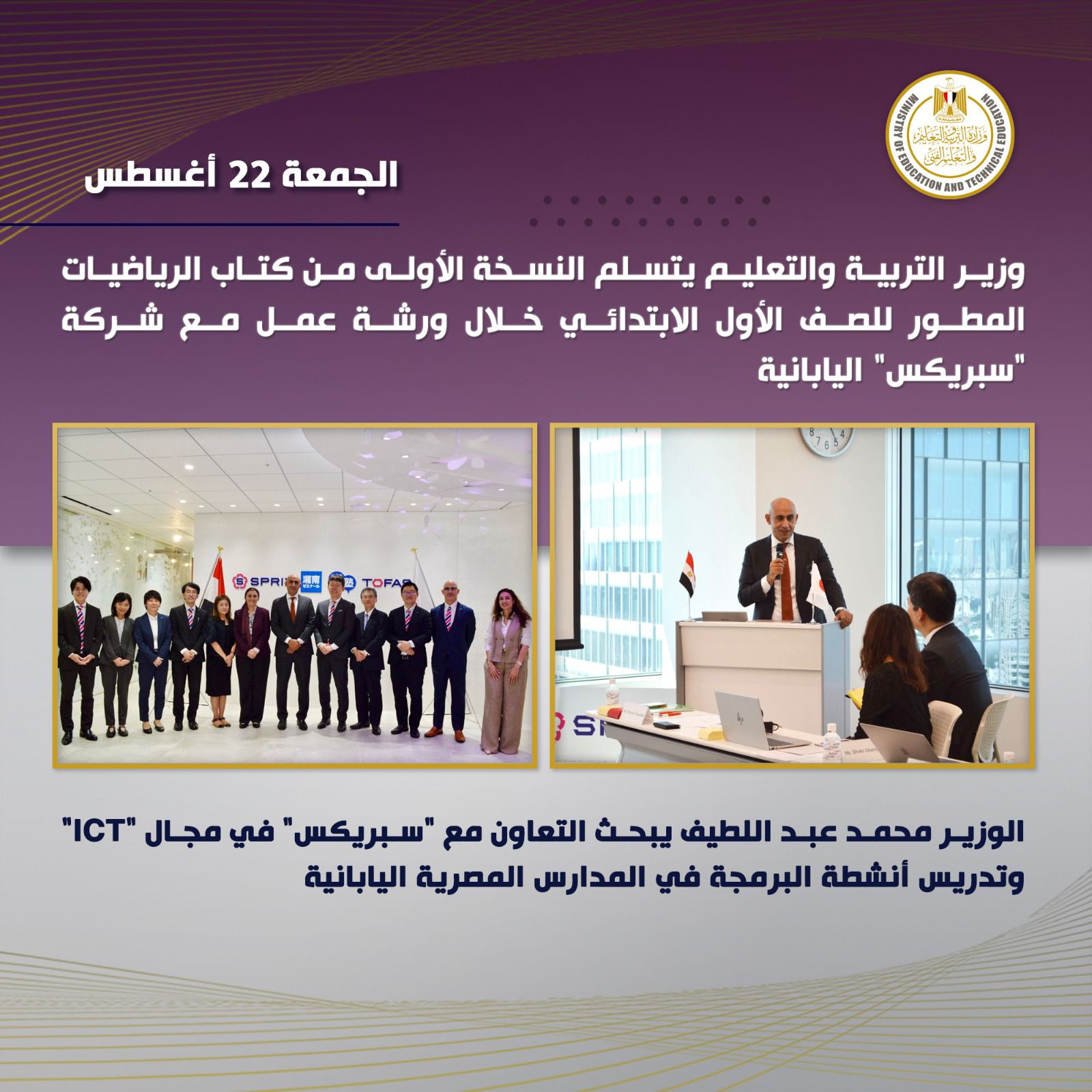 شارك السيد محمد عبد اللطيف وزير التربية والتعليم والتعليم الفني في ورشة عمل موسعة مع شركة "سبريكس" اليابانية حول إدخال مناهج جديدة في مادتي الرياضيات وتكنولوجيا المعلومات والاتصالات (ICT)، وذلك بحضور السيد تسوني ايشي رئيس الشركة، ومجموعة العمل المسؤولة عن التعاون مع وزارة التربية والتعليم بمدينة طوكيو عاصمة دولة اليايان.