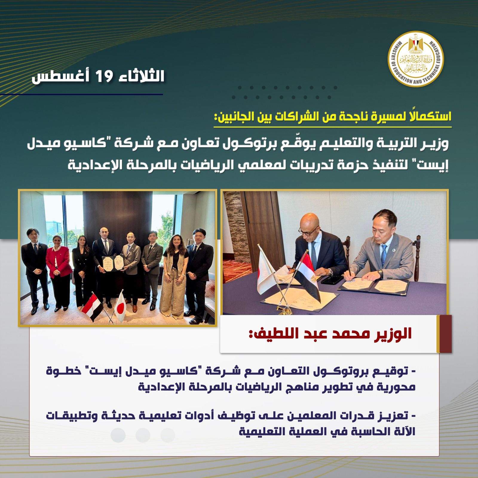وقّع السيد/ محمد عبد اللطيف، وزير التربية والتعليم والتعليم الفني، برتوكول تعاون مع شركة "كاسيو ميدل إيست"، وذلك على هامش فعاليات مؤتمر طوكيو الدولي للتنمية في أفريقيا “تيكاد ٩”.