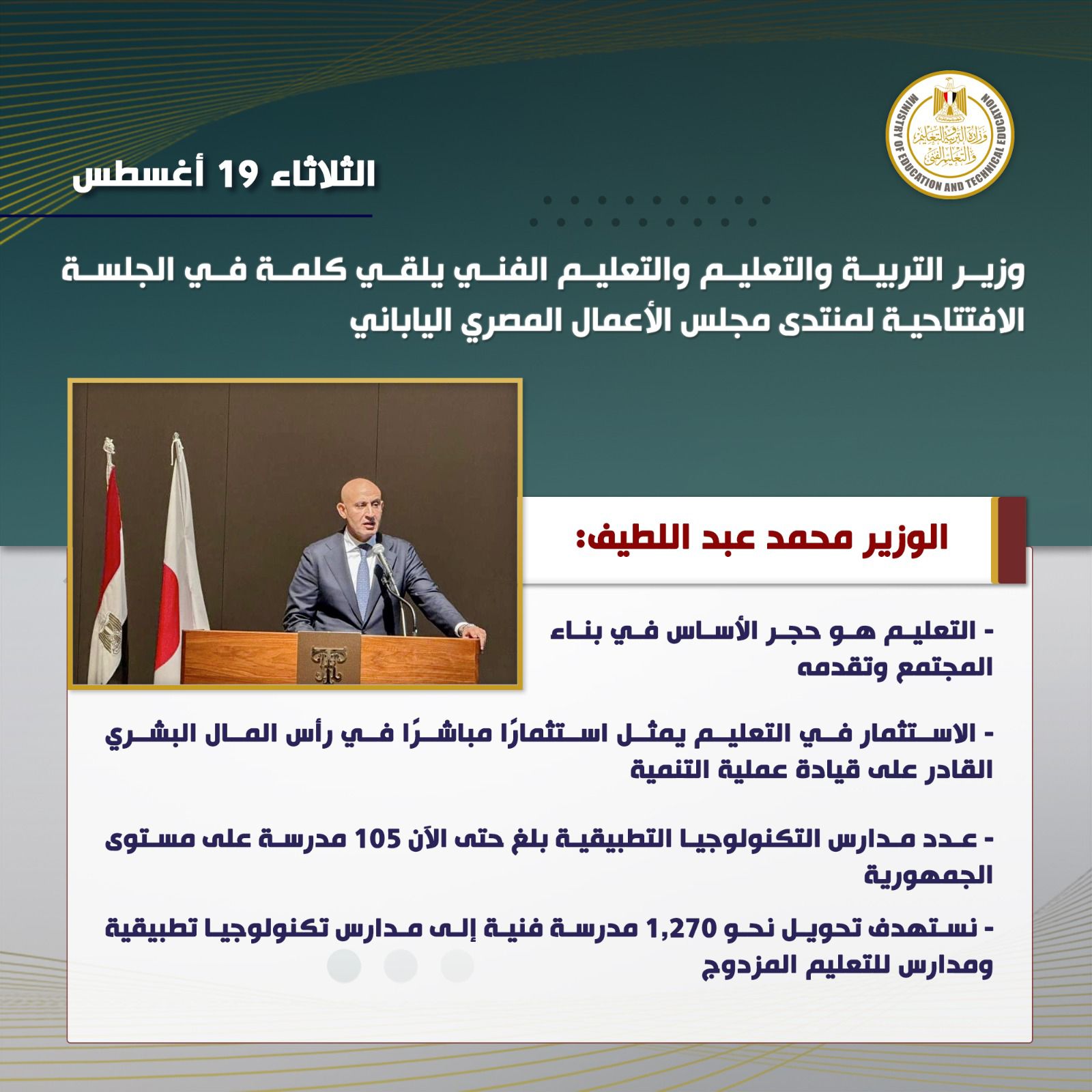 وأكد السيد الوزير محمد عبد اللطيف أن التعاون مع الجانب الياباني يعكس حرص الدولة المصرية على تطوير التعليم وفق أحدث النظم العالمية، مشيراً إلى أن إدخال مناهج جديدة في مادتي الرياضيات وتكنولوجيا المعلومات والاتصالات (ICT) يمثل نقلة نوعية في بناء قدرات الطلاب وتنمية مهاراتهم بما يتماشى مع متطلبات العصر.