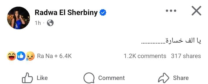 وكتبت رضوى الشربيني من خلال حسابها الرسمي عبر موقع التواصل الاجتماعي "فيسبوك"، قالت: "يا ألف خسارة"، وأثار تعليقها تفاعل كبير عبر مواقع التواصل الاجتماعي.