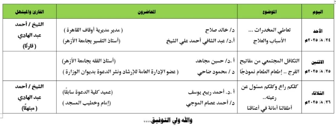 تعقد وزارة الأوقاف الأسبوع الثقافي بمسجد السيدة زينب رضي الله عنها بمديرية أوقاف القاهرة، وذلك في الفترة من يوم الأحد 24 أغسطس 2025م حتى يوم الثلاثاء 26 أغسطس 2025م، عقب صلاة المغرب مباشرة.