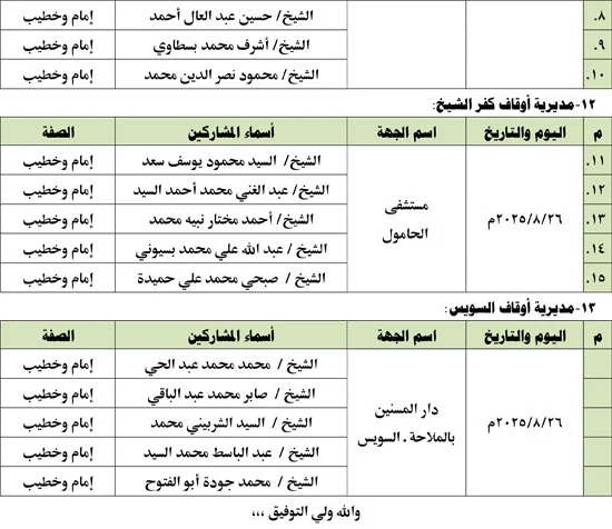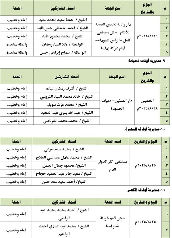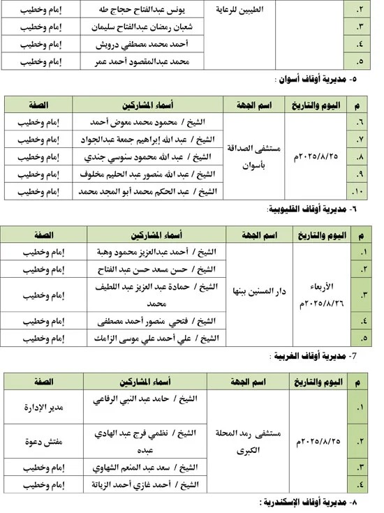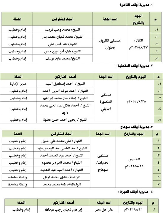 تنظم وزارة الأوقاف 13 قافلة دعوية وإنسانية ضمن برنامج "قوافل الرحمة والمواساة"، وذلك خلال الأسبوع الرابع من شهر أغسطس 2025م، بدءًا من الأحد 24 أغسطس وحتى الخميس 28 أغسطس 2025 م، قبل صلاة الظهر، متوجهة إلى عدد من المستشفيات ودور رعاية المسنين ودور الأيتام في مختلف المحافظات.