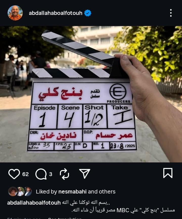 ونشر عبد الله أبو الفتوح صورة الكلاكيت، من خلال حسابه الرسمي عبر موقع تبادل الصور والفيديوهات القصيرة "إنستجرام"، وعلق: "بسم الله توكلنا على الله مسلسل بنج كلي على إم بي سي مصر قريبًا إن شاء الله".