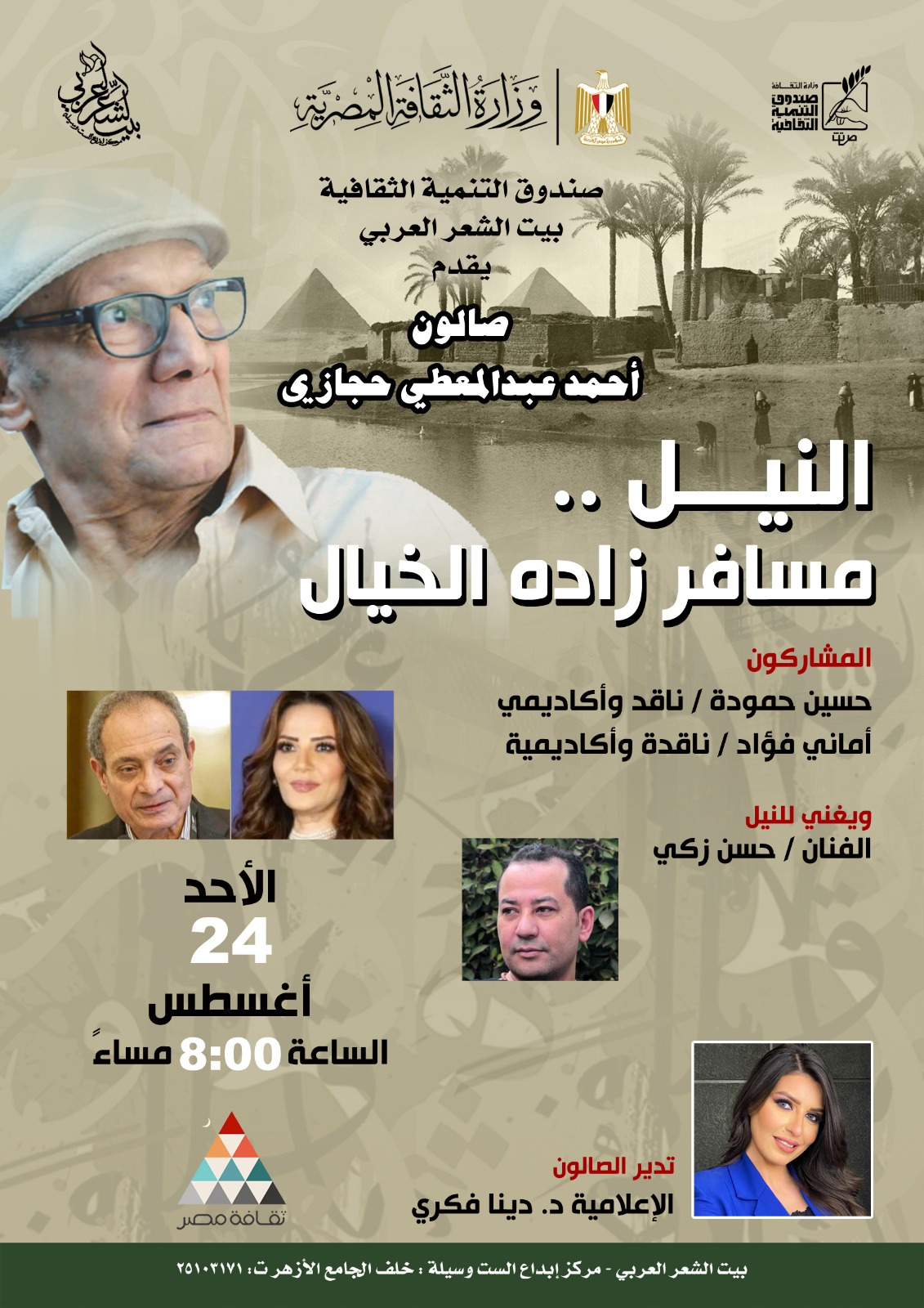 ينظم بيت الشعر العربي التابع لـقطاع صندوق التنمية الثقافية، صالونه الشهري والذى يناقش فيه قصيدة "النهر الخالد" للشاعر الكبير محمود حسن إسماعيل، وذلك في تمام الساعة الثامنة من مساء غداً (الأحد 24 أغـسـطـس )، بمقر البيت في مركز إبداع "بيت الست وسيلة" خلف الجامع الأزهر، وذلك ضمن برنامجه الثقافي لدعم الحركة الأدبية وتشجيع التواصل بين الأصوات الشعرية المعاصرة والقديمة.