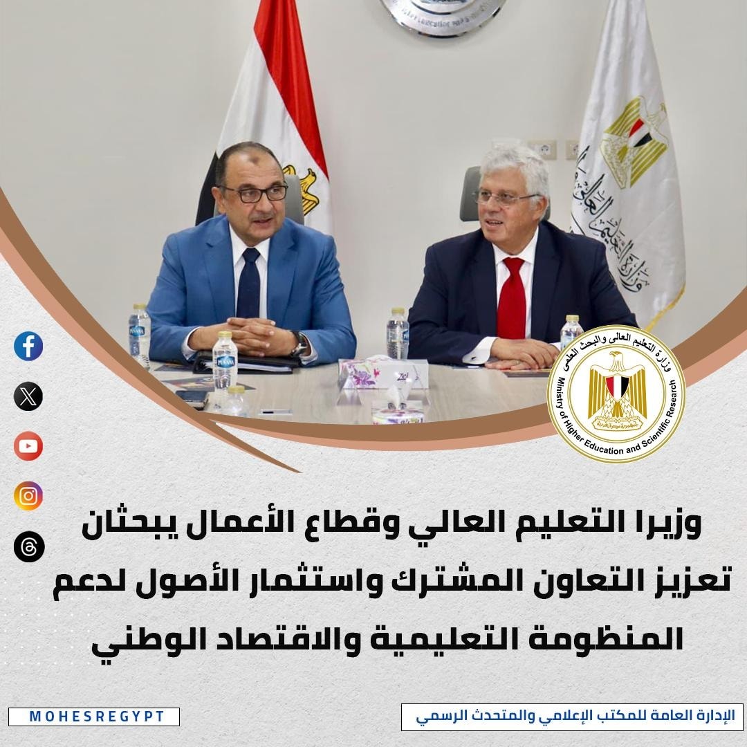 استقبل د. أيمن عاشور وزير التعليم العالي والبحث العلمي، المهندس محمد شيمي وزير قطاع الأعمال العام؛ لبحث آليات تعزيز التعاون المشترك بين الوزارتين، وتناول اللقاء بحث فرص التكامل بين الوزارتين في مجالات التدريب والتأهيل بما يحقق أهداف الدولة في ربط مخرجات التعليم بسوق العمل، ودعم خطط التنمية المستدامة، كما تمت مناقشة آليات تعظيم الاستفادة من عدد من الأصول المملوكة لشركات وزارة قطاع الأعمال العام والجهات التابعة لوزارة التعليم العالي؛ بما يضمن تحقيق أعلى عائد اقتصادي واجتماعي، ويسهم في دعم جهود الدولة نحو الاستخدام الأمثل للموارد.