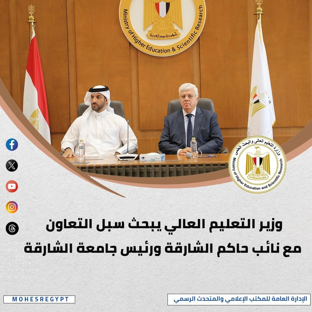 عقد الدكتور أيمن عاشور وزير التعليم العالي والبحث العلمي، اجتماعًا مع سمو الشيخ سلطان بن أحمد بن سلطان القاسمي، نائب حاكم الشارقة ورئيس جامعة الشارقة والوفد المرافق له؛ لبحث سبل التعاون المشترك بين الجانبين، وخلال الاجتماع بحث الجانبان سبل تعزيز التعاون المشترك في المجالات الأكاديمية والعلمية والبحثية، وسُبل تعظيم الاستفادة من المخرجات البحثية، بين الجامعات المصرية ونظيرتها الإماراتية، بما يعود بالنفع على البلدين الشقيقين، كما ناقش الجانبان بحث سبل زيادة التبادل العلمي بين الجامعات المصرية والإماراتية، وتكثيف برامج التبادل الطلابي وأعضاء هيئة التدريس، بالإضافة إلى بحث فرص الاستفادة من بنك المعرفة المصري كمنصة تعليمية وبحثية رائدة تساهم في تطوير مهارات الباحثين والطلاب في كلا البلدين.