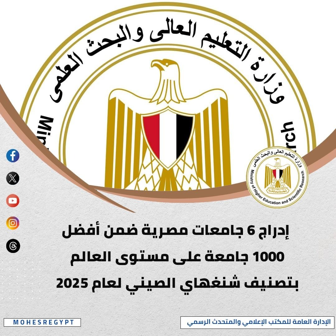 أعلن تصنيف شنغهاي الصيني نتائجه لعام 2025، حيث أظهرت نتائج التصنيف إدراج 6 جامعات مصرية ضمن قائمة أفضل 1000 جامعة على مستوى العالم، وذلك من بين 2500 جامعة شملها تقييم التصنيف لهذا العام لاختيار أفضل 1000 جامعة من بينها، وأكد الدكتور أيمن عاشور تقديره للتحسن المتواصل الذي تشهده الجامعات المصرية في مختلف التصنيفات الدولية، مشددًا على أن الحضور المميز لمؤسسات التعليم العالي المصرية، سواء كانت حكومية أو خاصة أو أهلية أو دولية أو تكنولوجية، يعكس جهودًا ملموسة للنهوض بالمنظومة التعليمية.