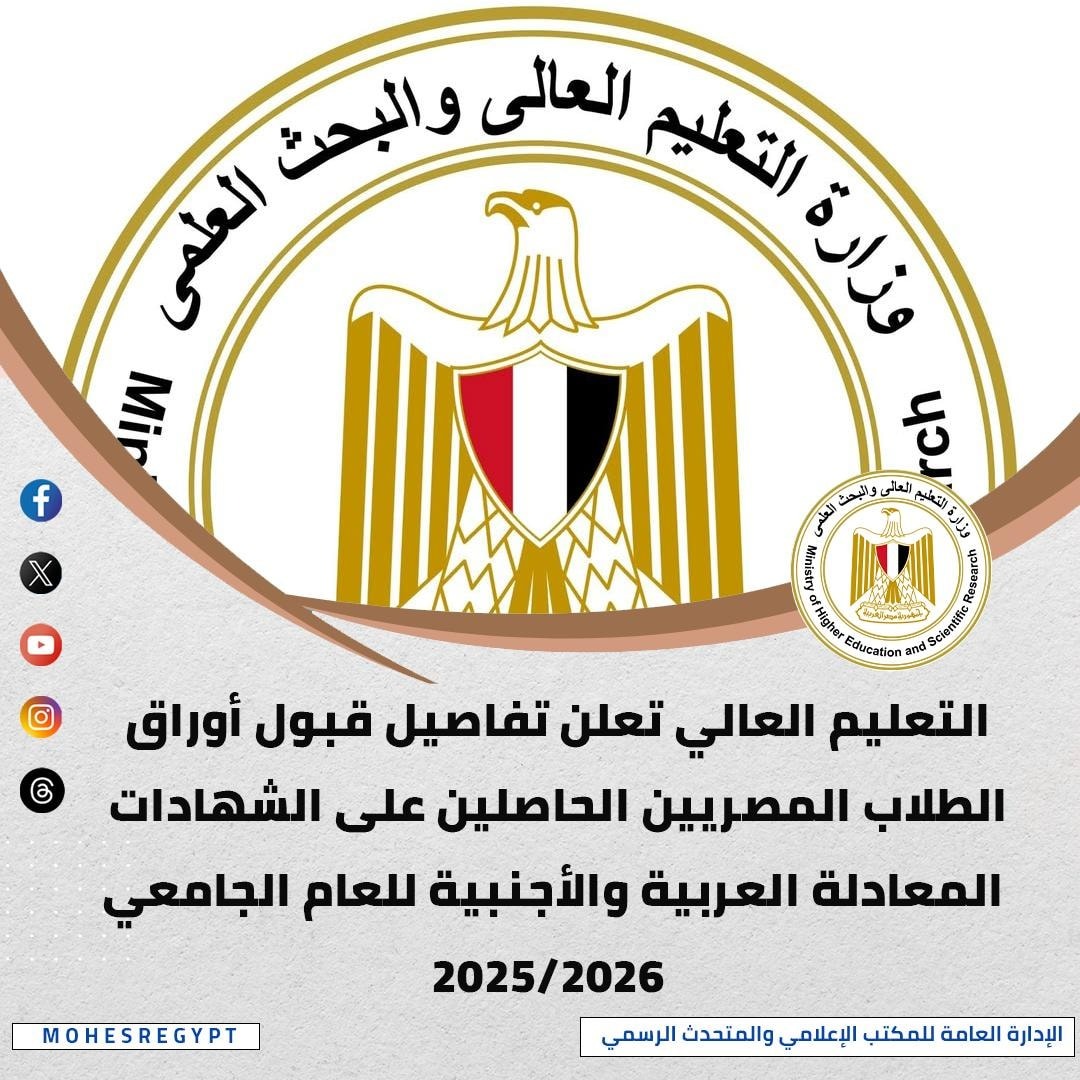 أعلن مكتب تنسيق القبول بالجامعات والمعاهد المصرية بوزارة التعليم العالي والبحث العلمي عن تفاصيل قبول أوراق الطلاب المصريين الحاصلين على الشهادات المعادلة العربية والأجنبية للعام الجامعي 2025/2026، حيث تقرر بدء مرحلة قبول الطلاب الحاصلين على الشهادات الثانوية المعادلة (العربية والأجنبية) اعتبارًا من يوم السبت الموافق 23/8/2025 وحتى يوم الاثنين الموافق 1/9/2025، وذلك بالمكتب الرئيسي بالقاهرة وفرعيه بالإسكندرية وأسيوط.