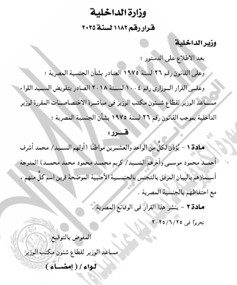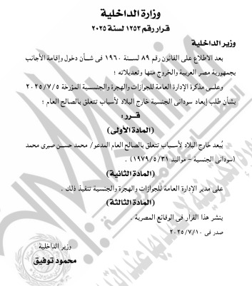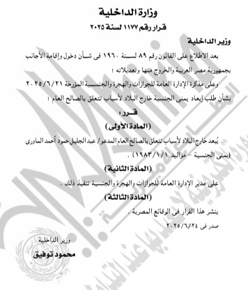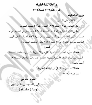نشرت الجريدة الرسمية اليوم، قرار وزارة الداخلية بالإذن لـ21 شخصا بالتجنس بجنسيات أجنبية المرفقة مقابل كل اسم في الكشف التالي، صدر هذا القرار بعد الاطلاع على القانون رقم 26 لسنة 1975 الصادر بشأن الجنسية المصرية، وقرار أخر برد الجنسية لـ21 أخرين مرفق أسمائهم في الكشف التالي وقرار بإبعاد 2 اجانب خارج مصر، لأسباب تتعلق بالصالح العام.