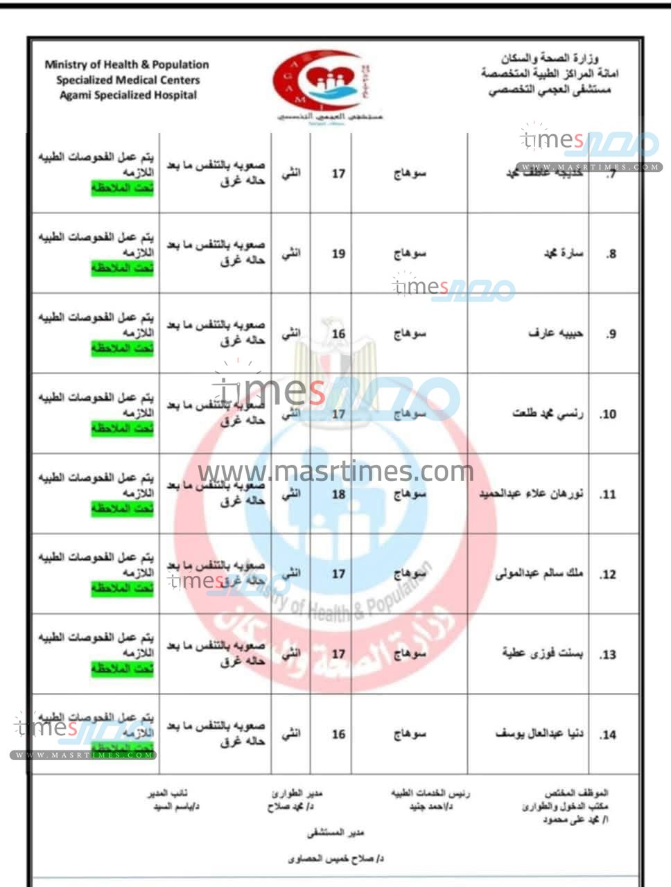 ووفقا للحصيلة الطبية، استقبل مستشفى العجمي النموذجي 14 حالة تخضع للعلاج بينها حالات خطرة، بينما استقبل مستشفى العامرية المركزي 13 حالة توفيت منهن 6، فيما استقبل أحد المستشفيات الخاصة 6 مصابات إضافيات.