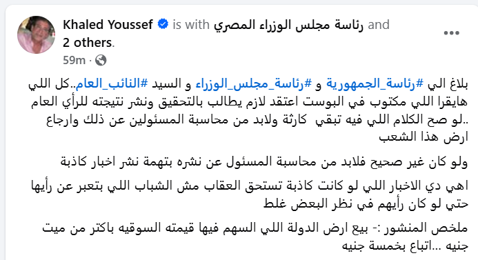 وأكد “يوسف” في منشور له عبر صفحته الرسمية على موقع التواصل الاجتماعي "فيسبوك"، أن ما يُثار إذا ثبتت صحته يمثل "كارثة تستوجب محاسبة المسؤولين وإعادة الأرض للشعب"، مشددًا على أنه في حال عدم صحته "يجب محاسبة من نشره بتهمة ترويج أخبار كاذبة".