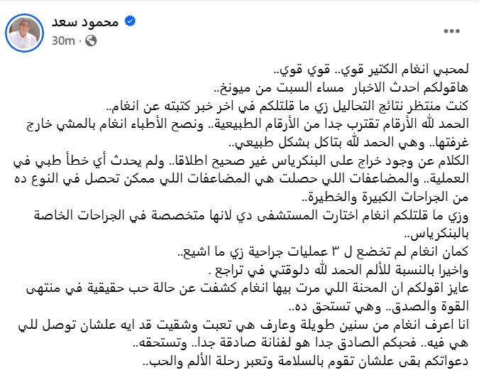 واختتم سعد رسالته مؤكدًا أن هذه المحنة أظهرت حجم الحب الكبير والصادق الذي تحظى به أنغام من جمهورها، قائلًا: