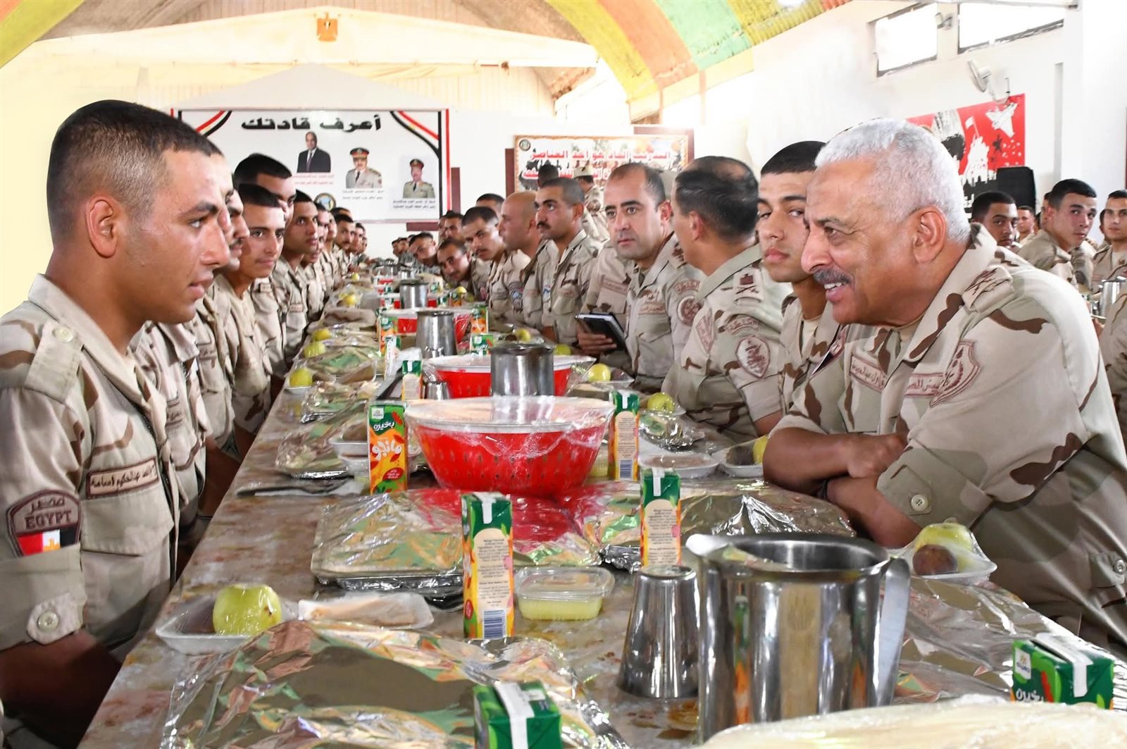 وألقى الفريق أول عبد المجيد صقر كلمة نقل خلالها تحيات وتقدير الرئيس عبد الفتاح السيسى رئيس الجمهورية القائد الأعلى للقوات المسلحة لرجال المنطقة الغربية العسكرية ، مشيداً بما يقدمه حماة الإتجاه الإستراتيجى الغربى من جهود وتضحيات لتنفيذ مهامهم بكفاءة وإقتدار ، مؤكداً على أن الحفاظ على الإستعداد القتالى العالى لمواجهة كافة التحديات هو الضمان الحقيقى لأمن وإستقرار الوطن فى ظل الأحداث والمتغيرات المتسارعة التى تشهدها المنطقة ، كما إستعرض القائد العام للقوات المسلحة تطورات الأوضاع بالمنطقة وما يتطلبه ذلك من ضرورة الإرتقاء بمستوى الوعى والفهم الصحيح للمقاتلين إرتباطاً بما يدور حولهم من أحداث ، موصياً المقاتلين بالحفاظ على الروح المعنوية العالية والإنضباط الذاتى تأكيداً على أن رجال القوات المسلحة هم رمز العزة والكرامة والنموذج الذى يحتذى به فى البذل والعطاء من أجل الوطن ، كما شاركهم تناول وجبة الغداء معرباً عن تقديره لما إتسم به المقاتلين من إعتزاز وفخر تجاه ما يقدمونه للوطن حتى ينعم بالأمن والإستقرار .
