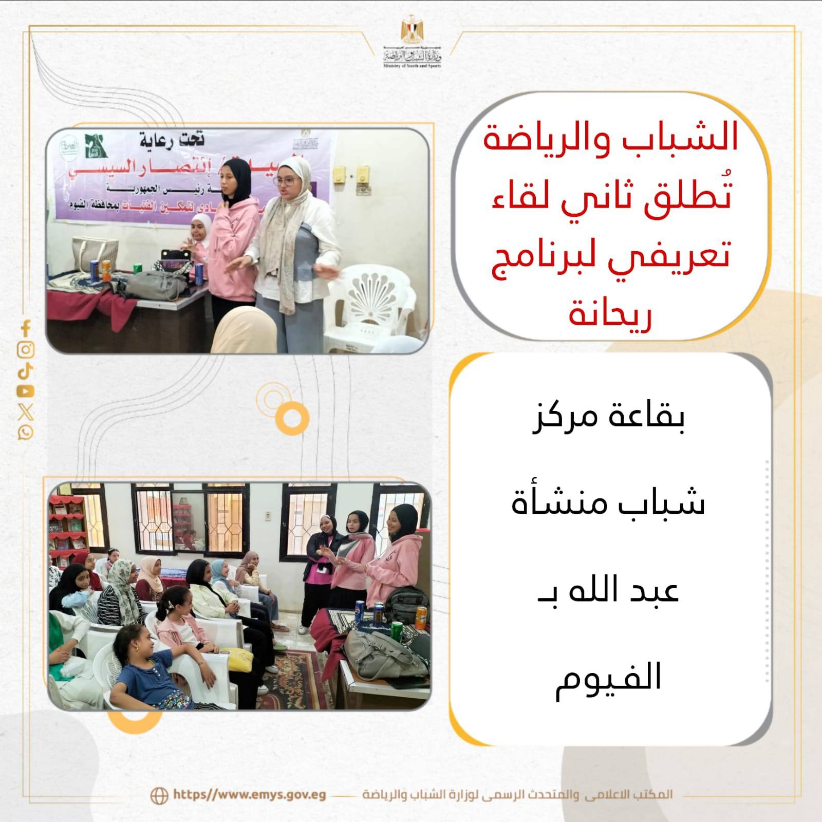 تحت رعاية السيدة انتصار السيسي ، قرينة السيد رئيس الجمهورية، أطلقت وزارة الشباب والرياضة ، من الادارة المركزية لتنمية النشء ، بالتعاون مع مديرية الشباب والرياضة بمحافظة الفيوم، اللقاء التعريفي الثاني ببرنامج "ريحانة" بمركز شباب منشأة عبد الله، بمشاركة 40 فتاة من أعضاء المركز.
