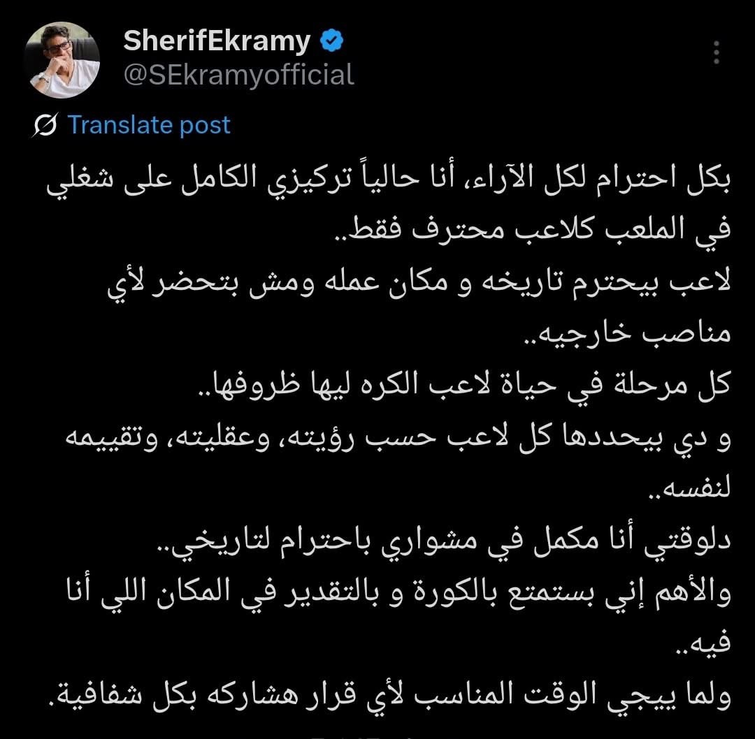 وقال إكرامي عبر حسابه الرسمي على منصة "إكس": "بكل احترام لكل الآراء، تركيزي الآن منصب على عملي داخل الملعب فقط، كلاعب محترف، ولا أستعد في الوقت الحالي لأي مناصب خارجية ، كل مرحلة في حياة اللاعب لها ظروفها، ويحددها كل لاعب حسب رؤيته وتقييمه لنفسه".