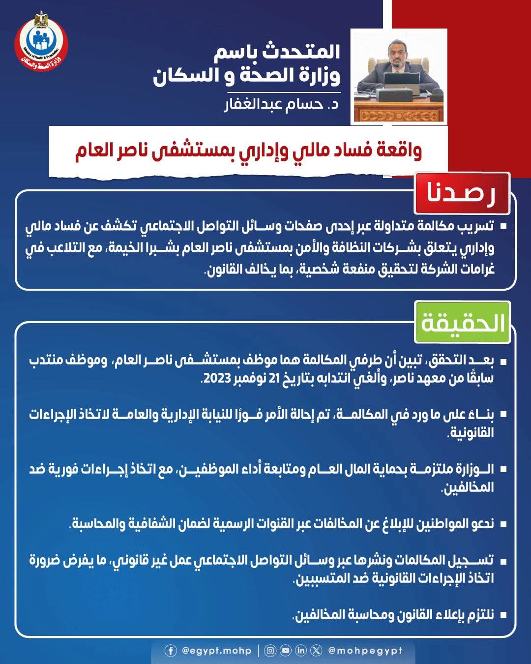 أكد الدكتور حسام عبدالغفار، المتحدث الرسمي باسم وزارة الصحة والسكان، أنه فور التحقق من المكالمة المتداولة عبر وسائل التواصل الاجتماعي بشأن وجود شبهة فساد مالي وإداري بمستشفى ناصر العام، تبين أن طرفي المكالمة هما موظف بالمستشفى وموظف منتدب سابقًا من معهد ناصر، وأنهي انتدابه بتاريخ 21 نوفمبر 2023.