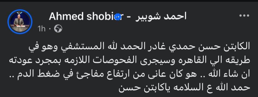 وختم شوبير رسالته بالدعاء لحمدي قائلا: "الحمد لله على السلامة يا كابتن حسن".