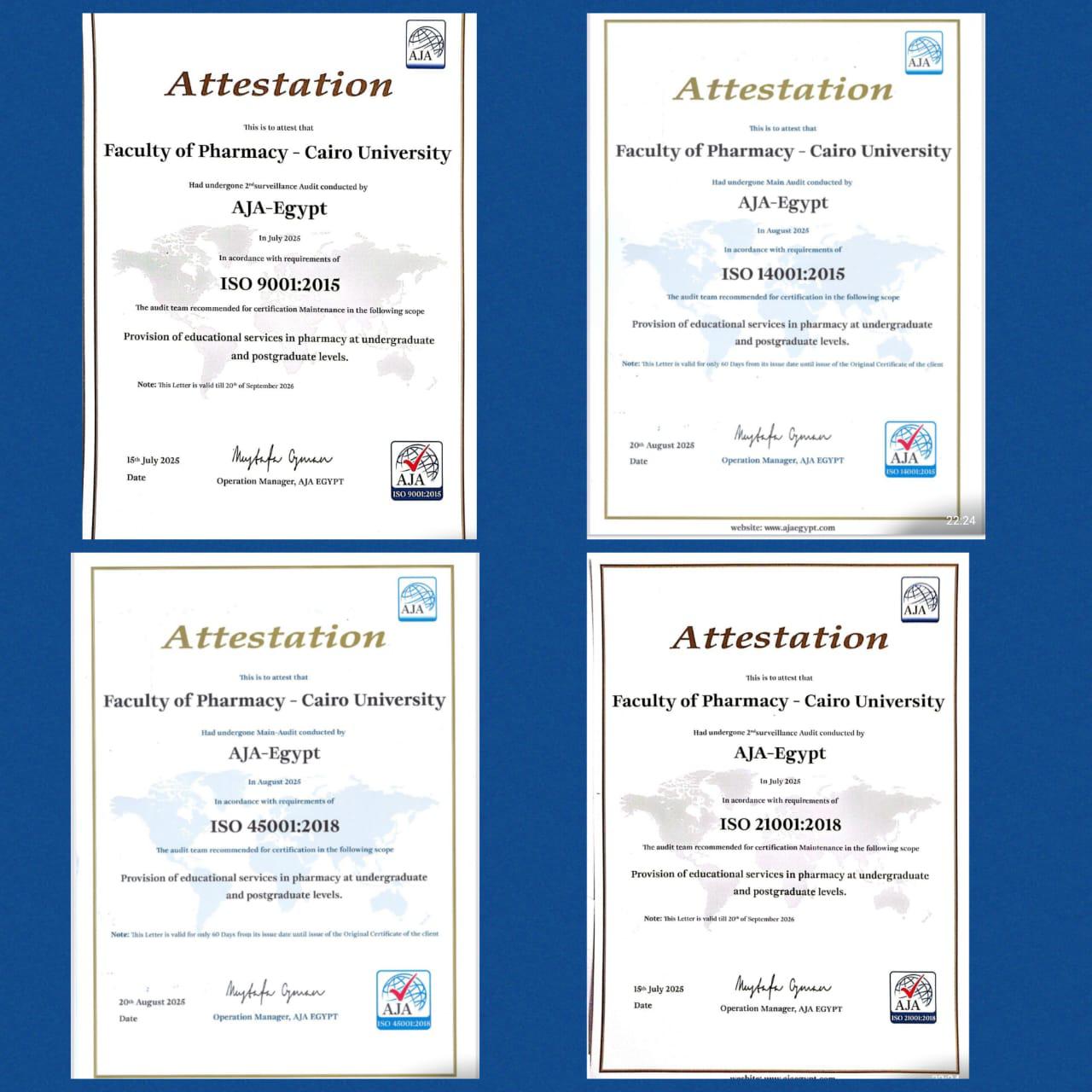 تواصل جامعة القاهرة، برعاية د.محمد سامى عبدالصادق رئيس الجامعة، تميز كلياتها ومعاهدها ومراكزها البحثية، على مختلف المستويات، حيث حصلت كلية الصيدلة على تجديد شهادة أيزو إدارة الجودة ISO. 9001:2015 ، وأيزو إدارة المؤسسات التعليمية ISO 14001:2018، وللمرة الأولى تحصل على أيزو إدارة البيئةISO. 14001:2015 ، وأيزو إدارة السلامة والصحة المهنية ISO 45001:2018، وذلك طبقا لتوصية لجنة المراجعة الدولية التي أنهت زيارتها لمراجعة أنظمة الجودة التى تطبقها كلية الصيدلة.