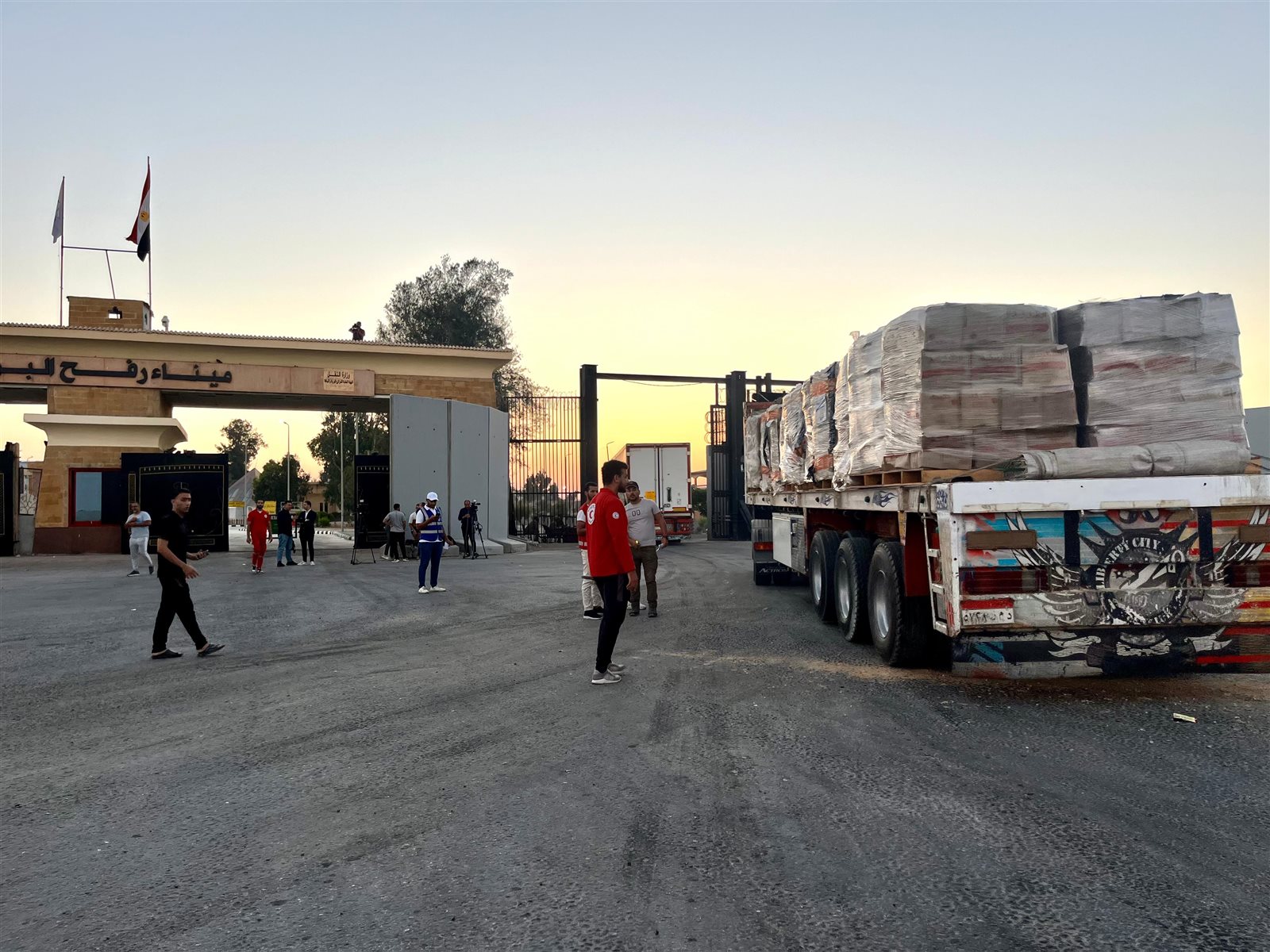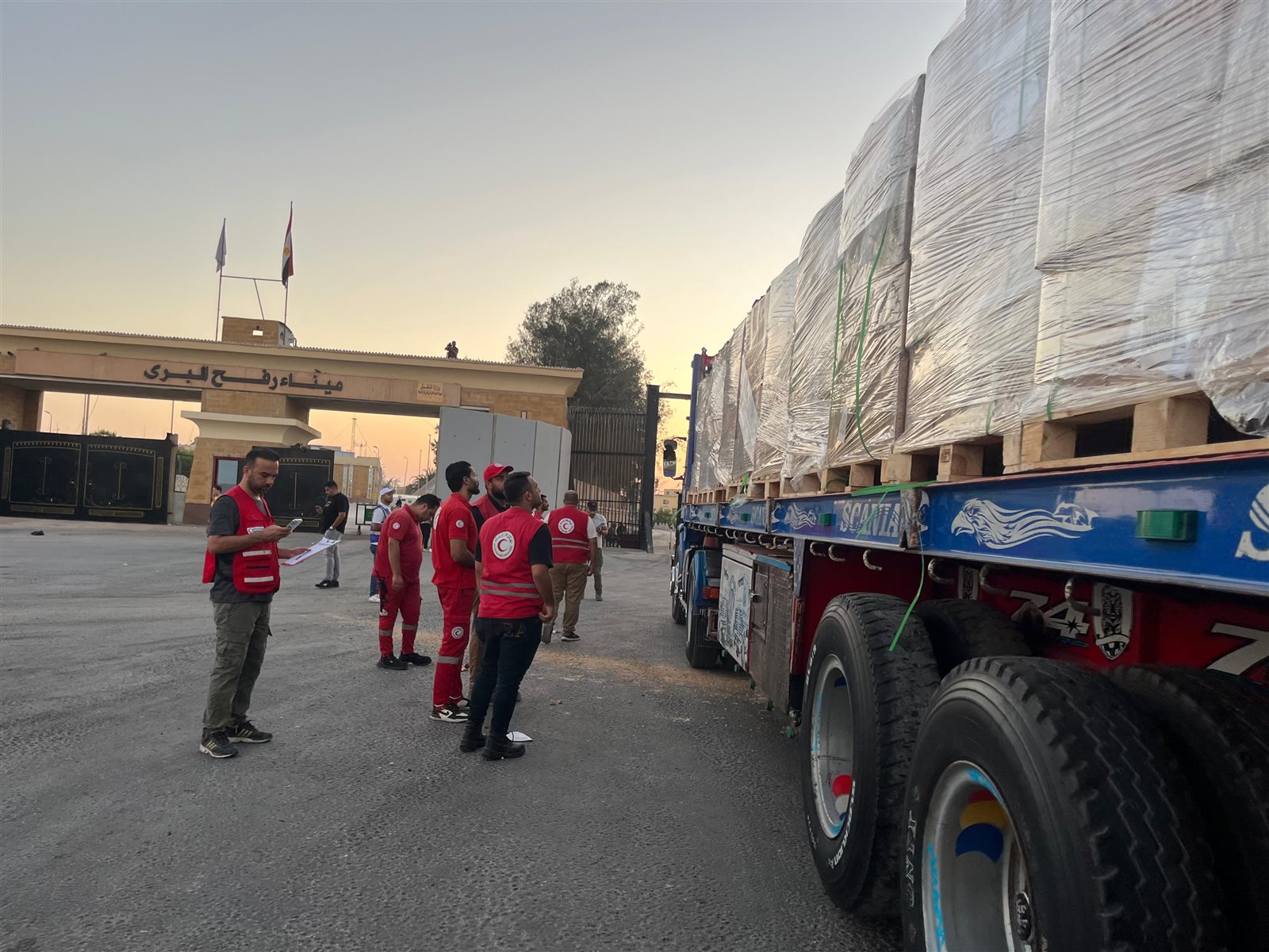 ويتواجد الهلال الأحمر المصري كآلية وطنية لتنسيق وتفويج المساعدات إلى غزة، على الحدود منذ بدء الأزمة حيث لم يتم غلق معبر رفح من الجانب المصري نهائيًا، وواصل تأهبه فى كافة المراكز اللوجستية وجهوده المتواصلة لدخول المساعدات التي بلغت أكثر من نصف مليون طن من المساعدات الإنسانية و الإغاثة، وذلك بجهود 35 ألف متطوع بالجمعية.